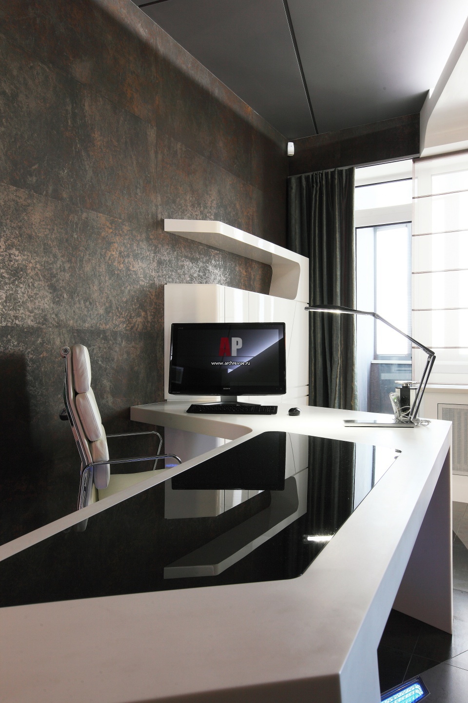 Дизайн кабинета. В квартире установлена система «умный дом» и использованы самые разнообразные технические новинки, которые встроены в единую систему управления. Например, розетки для ноутбука на рабочем столе выдвигаются из столешницы.