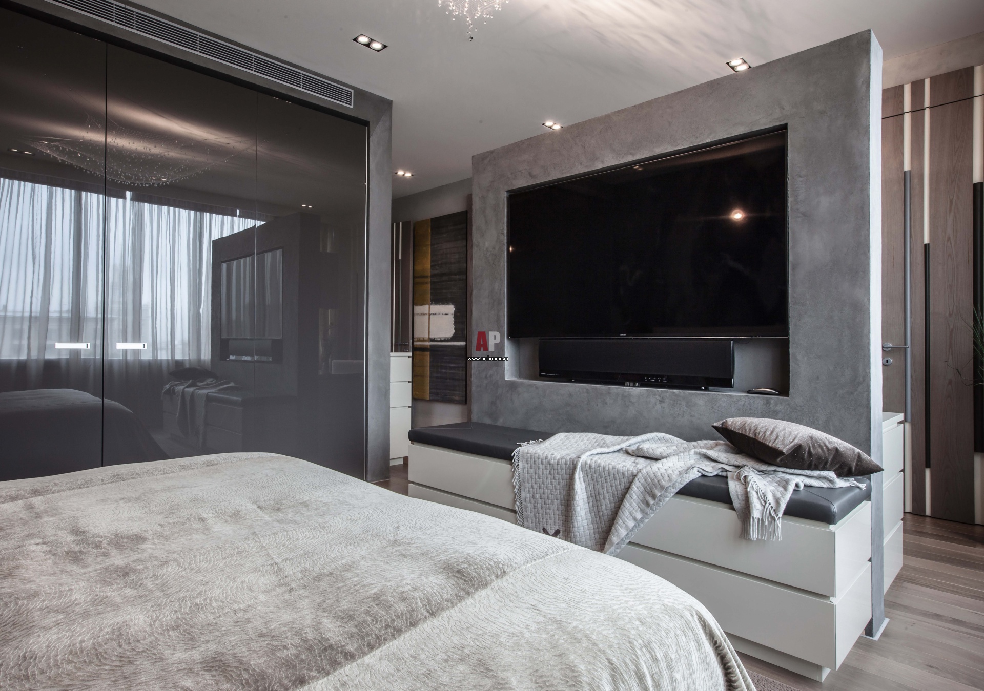 Оформленный серой рельефной штукатуркой простенок делит спальню на два помещения. Со стороны кровати он выполняет функцию панели для ТВ. Дверцы шкафа-купе выполнены из черного стекла.