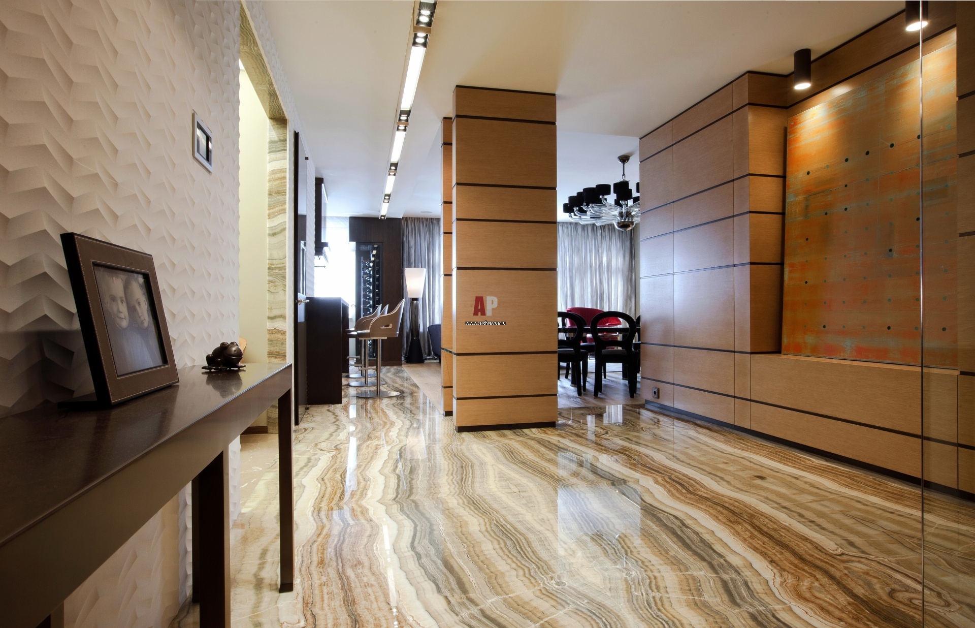 Интерьер входной зоны строится на контрасте цветов и фактур. Пол выложен ониксом. Ниша и колонна зашиты панелями и дуба с бронзовой расшивкой. Стена напротив отделана плиткой из известняка с трехмерной фрезеровкой. Картина работы немецкого художника и математика Юлиуса Кершера.