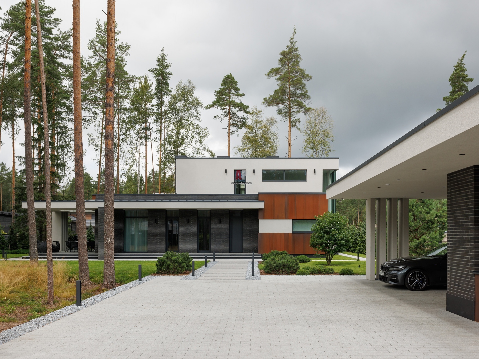 Яркая конструктивная особенность дома – консольные свесы кровли над террасой. Длина выносов с обеих сторон – более трех метров. На въезде на участок – гараж, построенный в общем с домом стилистике.