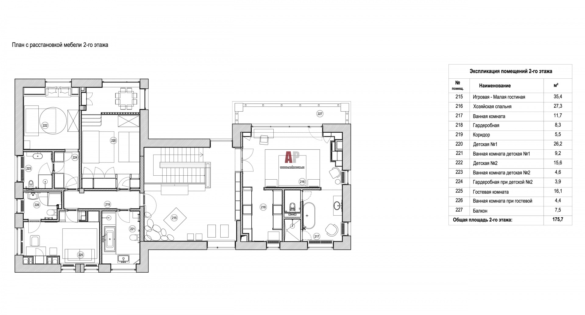 План второго этажа двухэтажного жома с большой детской зоной. Общая площадь – 425 кв. м.