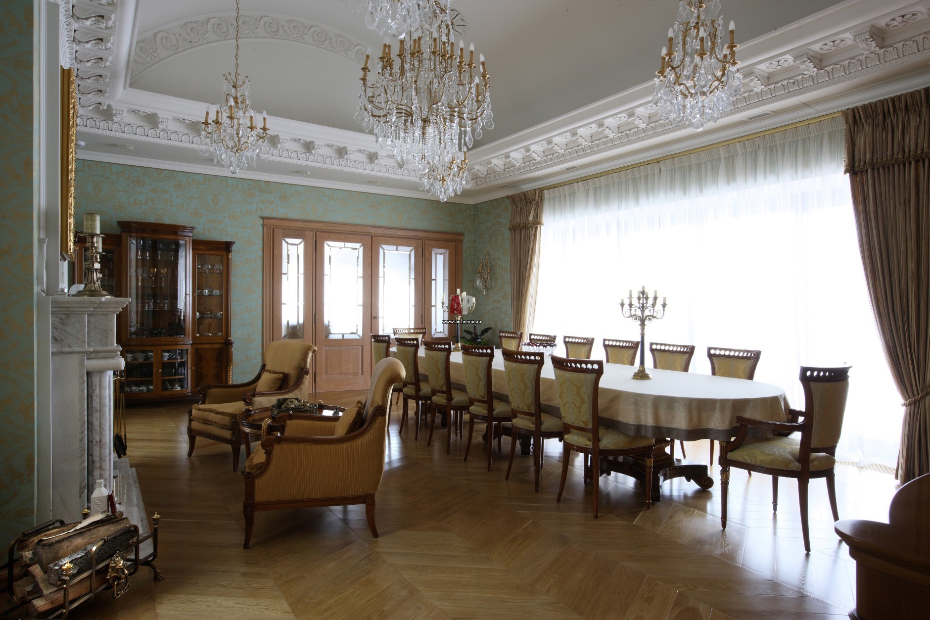 Столовая богато украшена воздушной лепниной, производитель «Уни+», обоями Zuber и совмещена с открытой террасой, кухней и бильярдной. Через витраж во всю стену из нее открывается роскошный вид на фонтан и яблонево-вишневый сад.