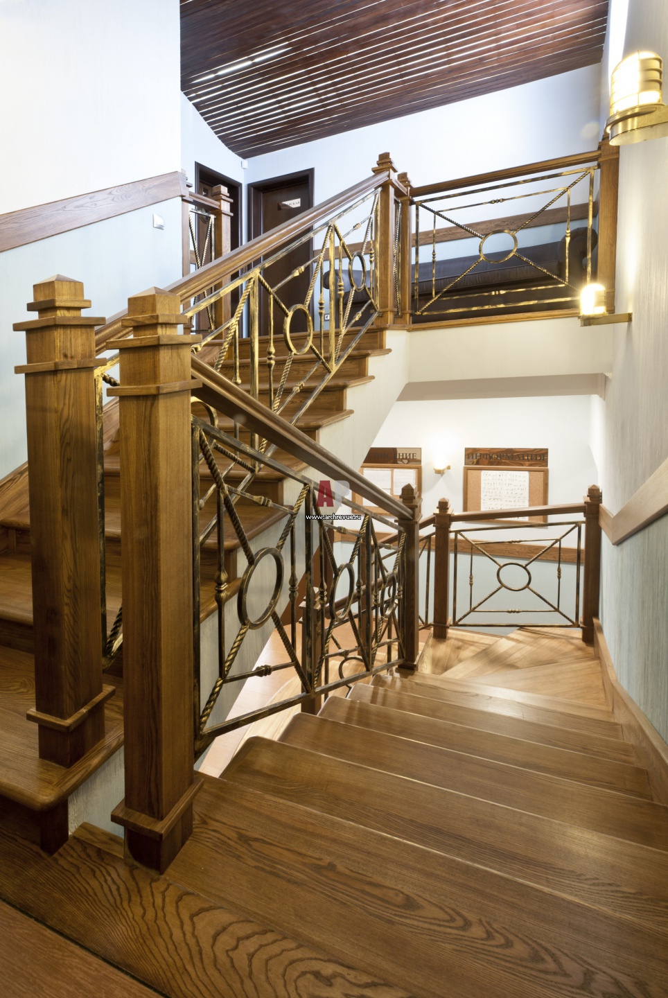 Деревянная лестница с металлическим ограждением. Кованое ограждение лестницы исполнено в виде морских канатов.