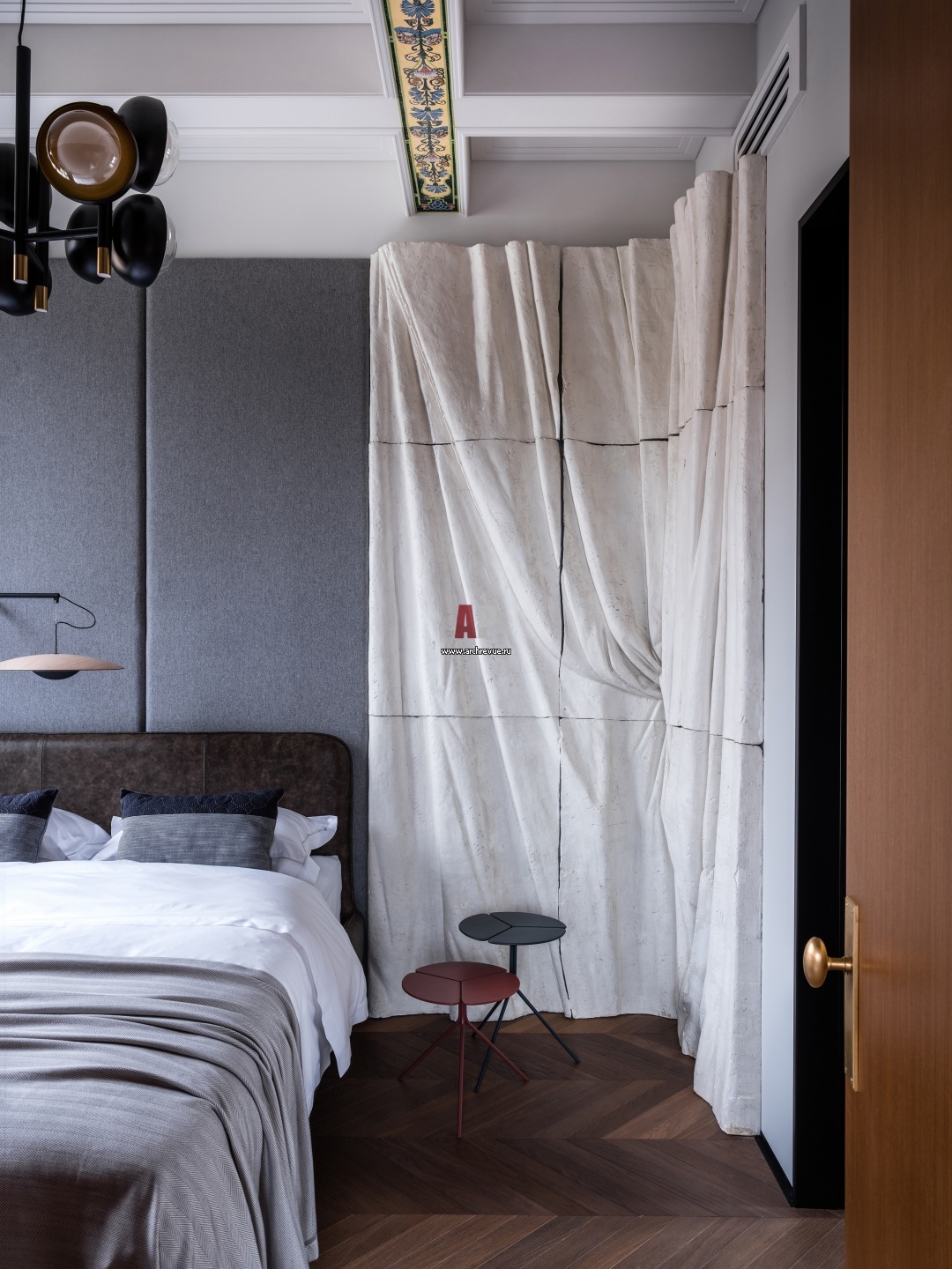 Арт-объект в спальне – гипсовая портьера. «Да, прямо натуральный гипс, со всей своей холодностью, тяжестью и фактурой! С таким масштабом я давно хотела поработать», - отмечает Светлана Дикушина.