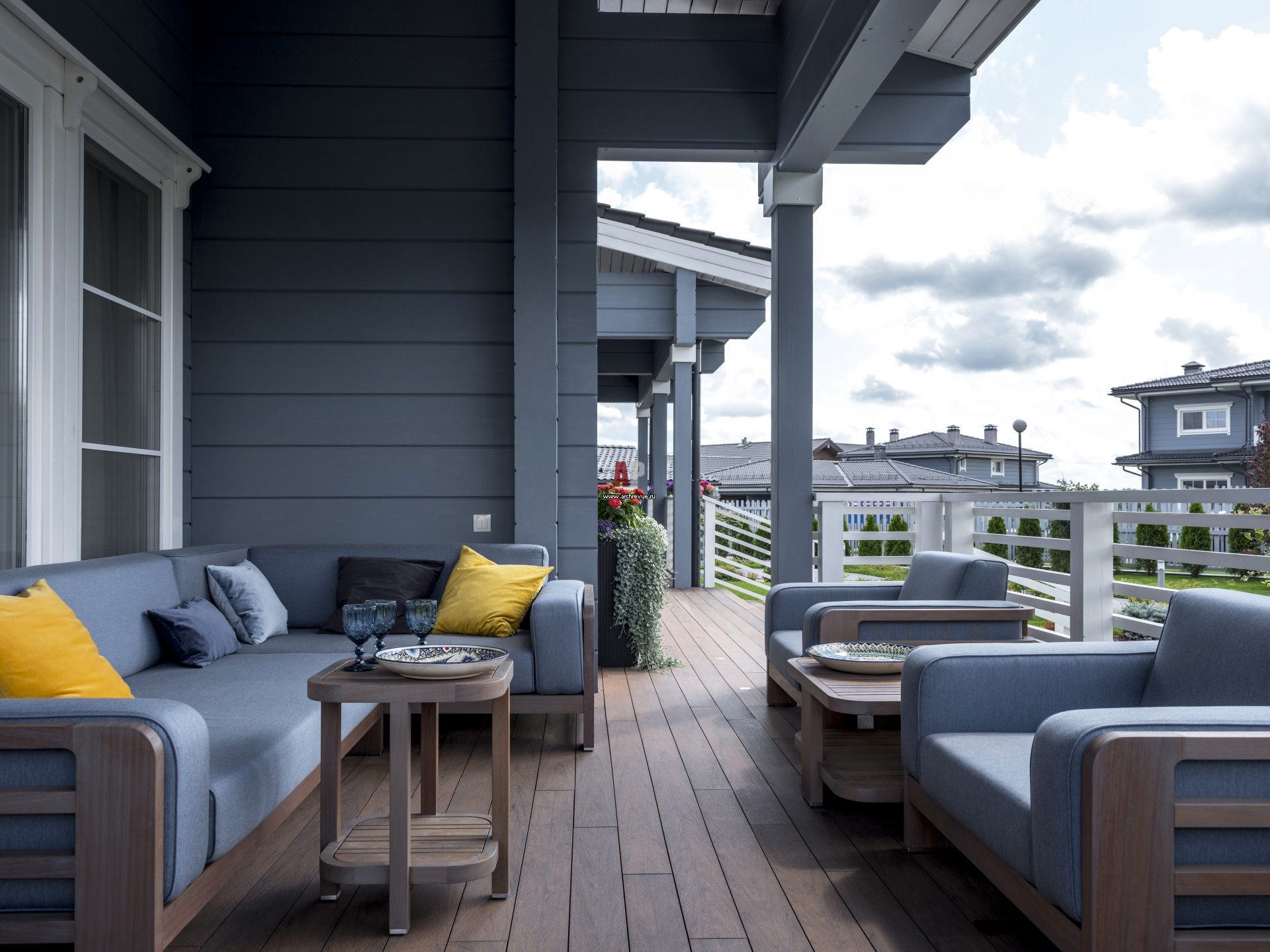 Двухэтажный деревянный дом на берегу Истры. Веранда. Уличная мебель изготовлена из экзотической породы дерева, Yachtline, Россия.