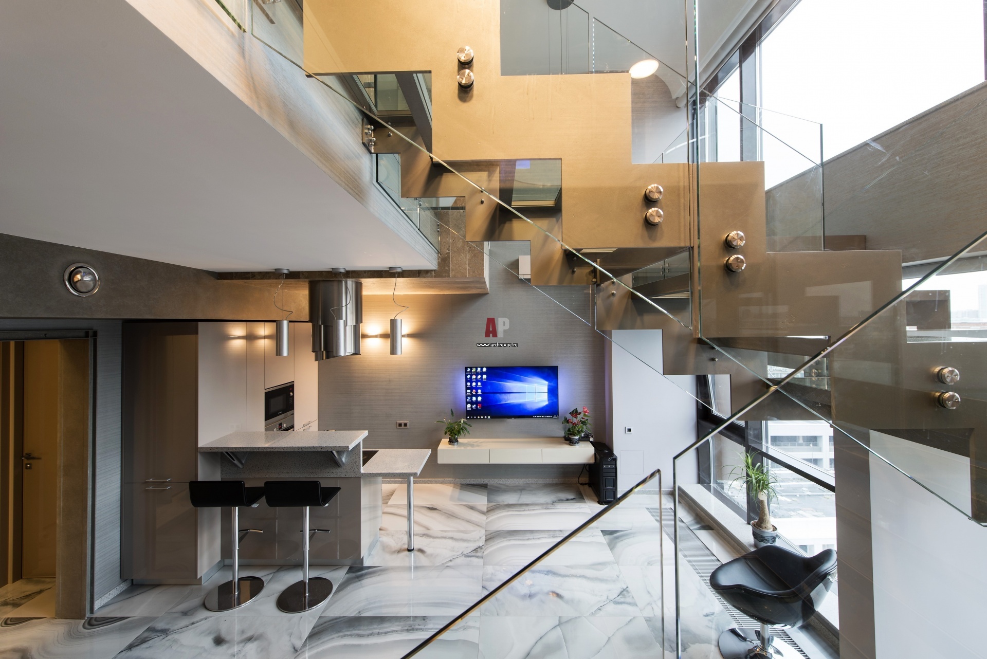 Кухня в квартире-студии решена в едином пространстве с гостиной. Кухонный гарнитур с барной стойкой в стиле хай-тек. Кухня, Varenna, модель Alea.