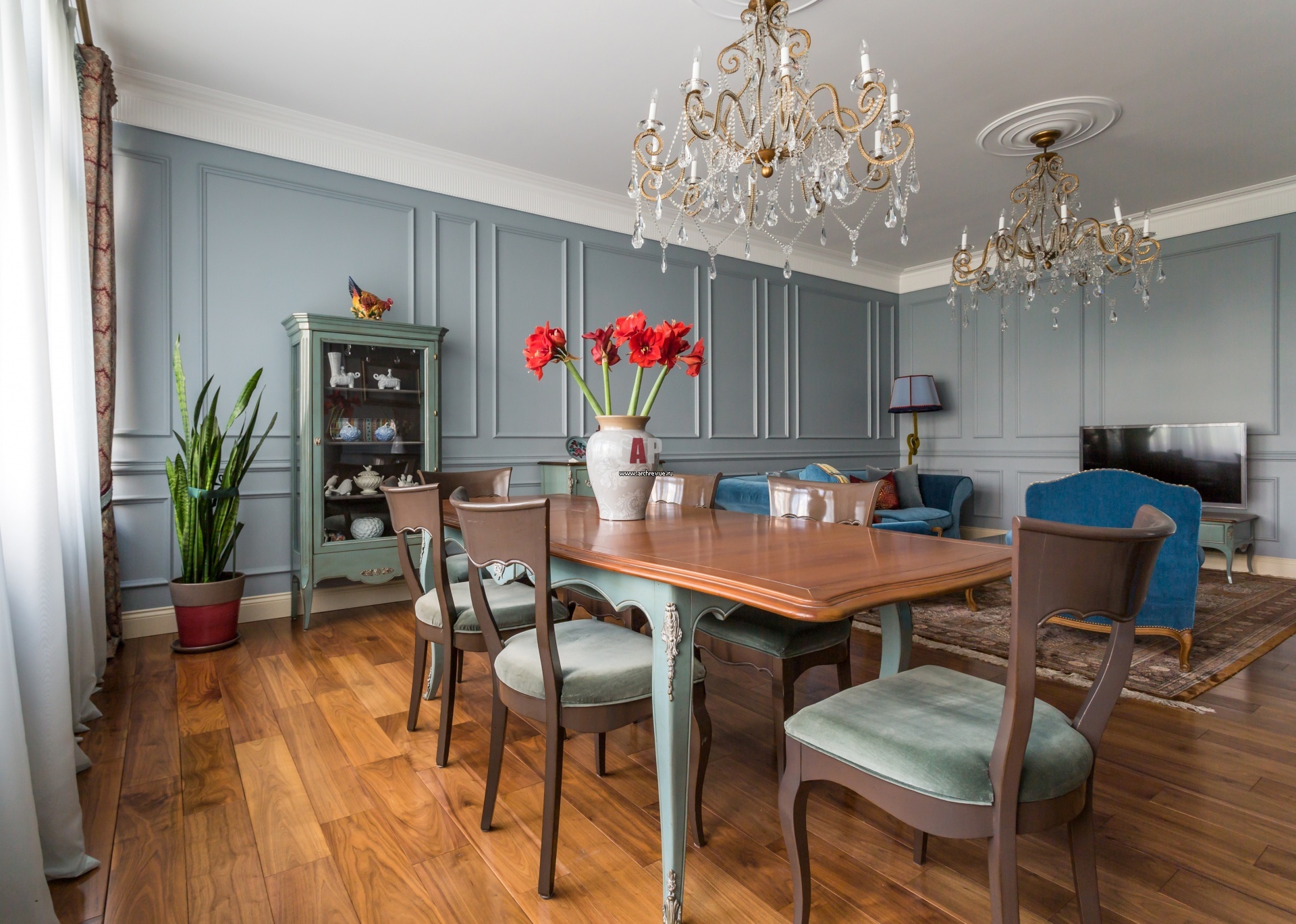 Квартира площадью 160 кв. м имеет традиционную планировку. Центральное помещение ней – просторная гостиная, объединенная с парадной столовой (она расположена возле окна).