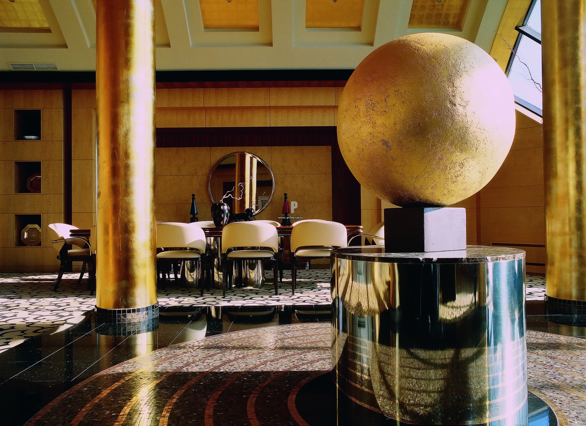 Вид из центра гостиной на столовую. Функциональные зоны в помещении группируются вокруг декоративной композиции с золотыми колоннами и шаром.