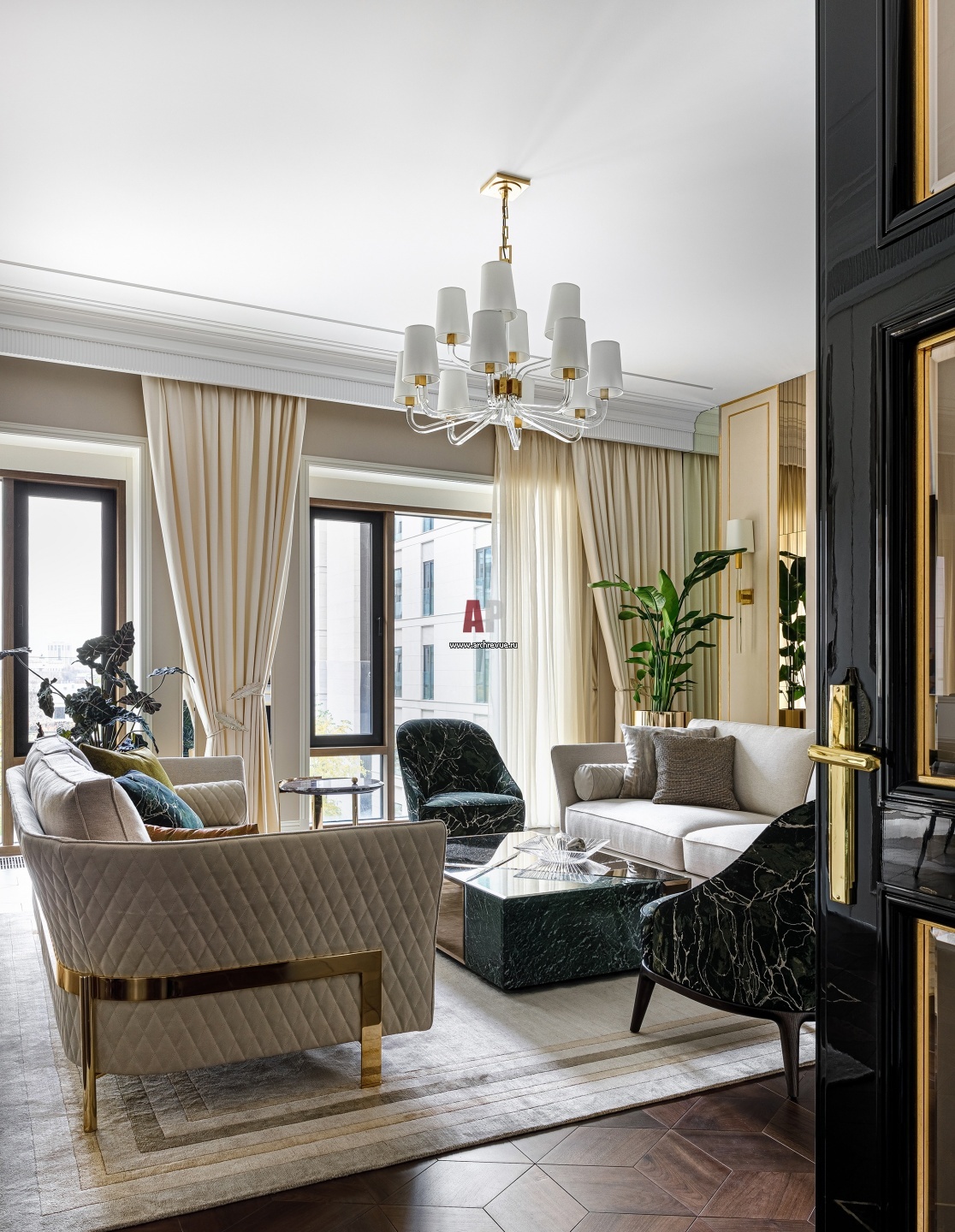 Теплая и уютная квартира с атмосферой праздника. Вид из холла в гостиную. На полу – художественный паркет из реликтового ореха с декоративными вставками керамогранита и латуни. Ковер, Art de Vivre. Люстра, бра Chapman & Myers.