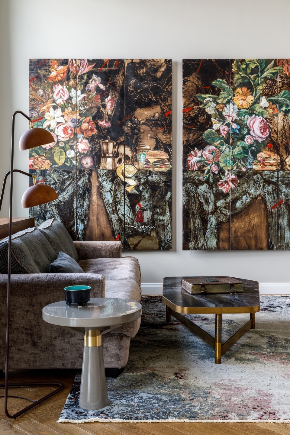 Светлый пентхаус в оттенках московского неба. Торшер, Mammalampa (Латвия). Больших размеров диптих Ильи Гапонова задает масштаб. Высота потолков в жилых помещениях составляет 4 метра.