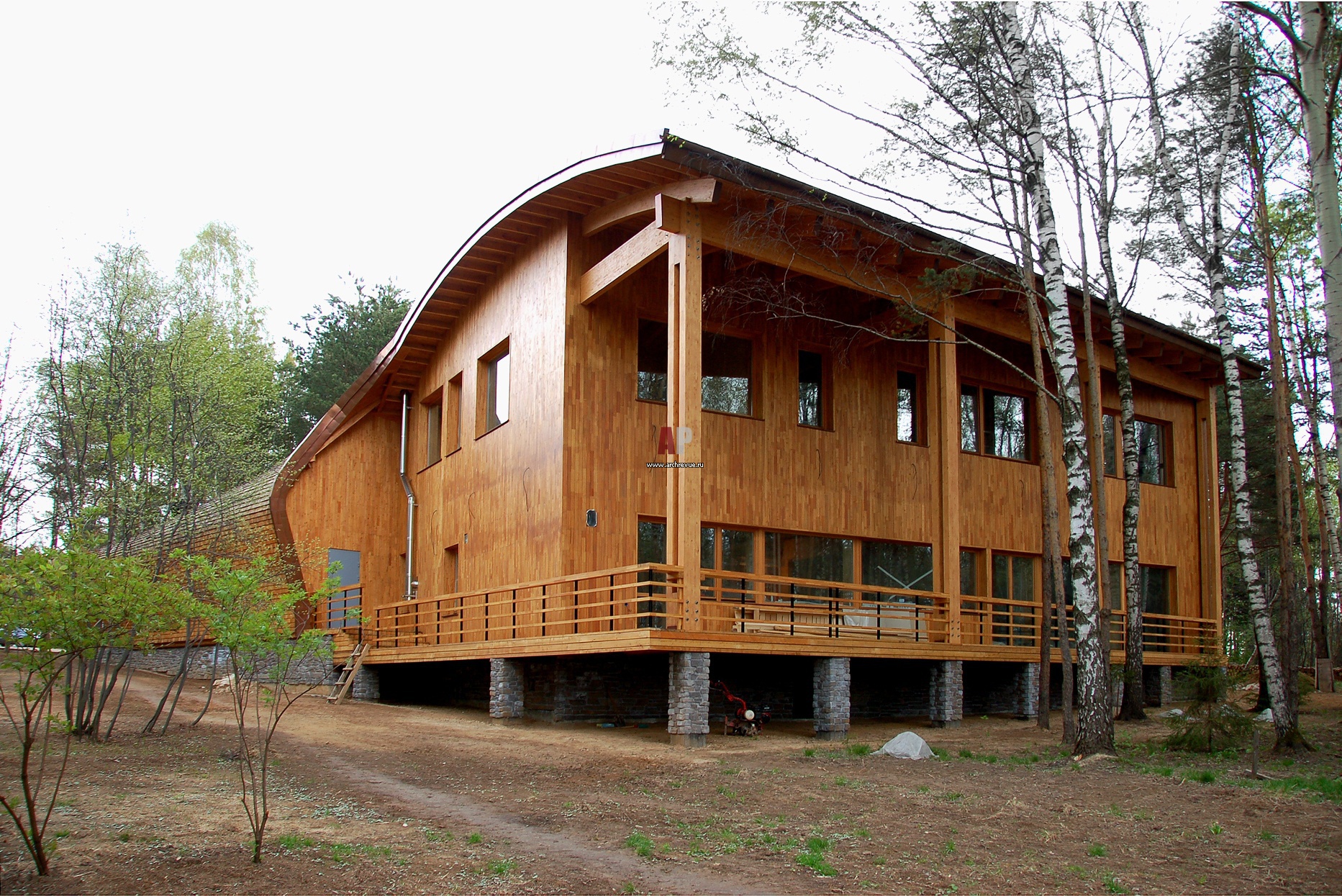 Главный объем здания поставлен на сваи, что позволило оставить нетронутым небольшой изгиб рельефа.