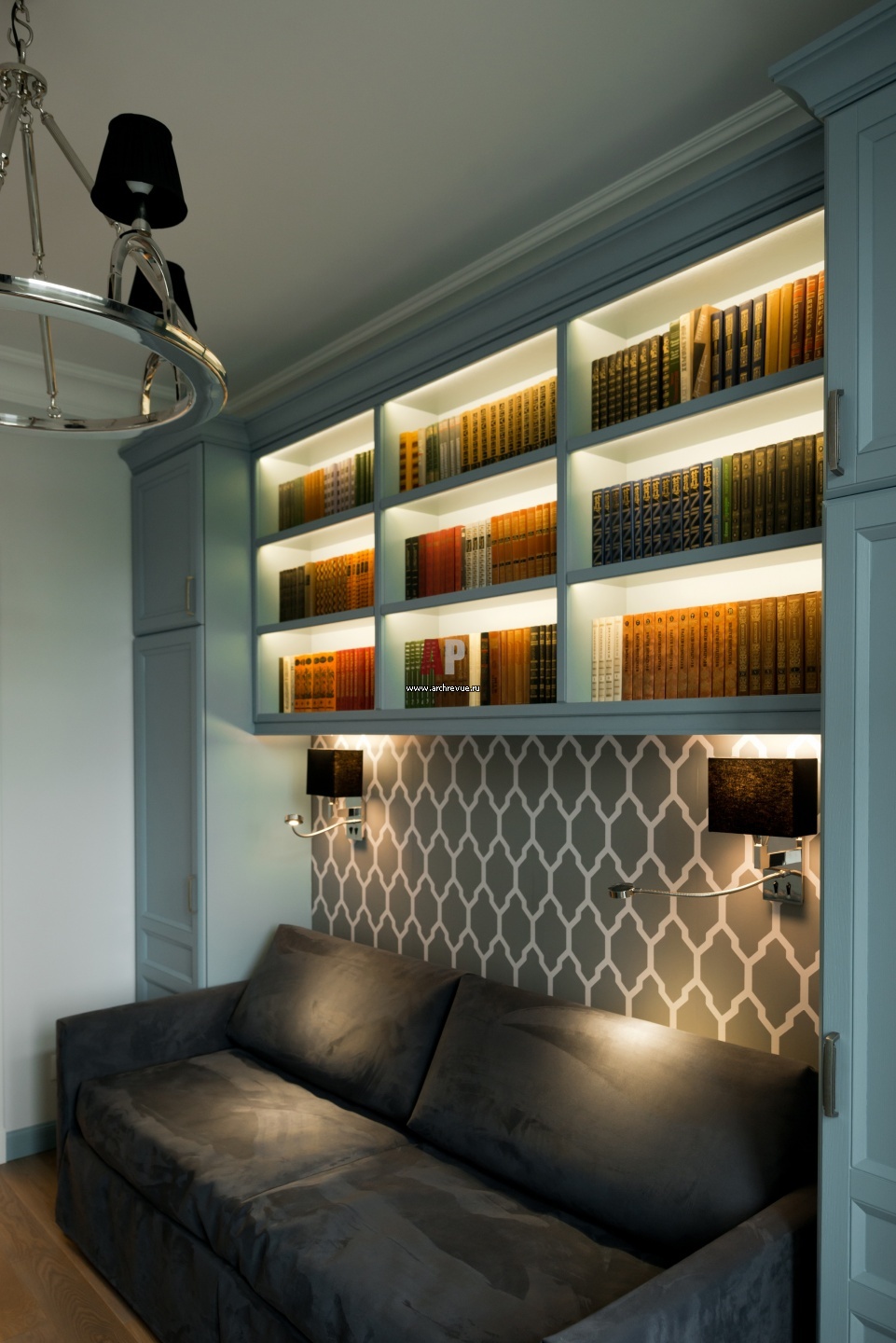Библиотечный шкаф в кабинете сделан на заказ. Полки оснащены подсветкой, которая подчеркивает геометрию пространства. В нише размещен диван, стена за ним оклеена серыми обоями с современным рисунком. Мебель индивидуального изготовления, «Ассоциация русских мастеров».