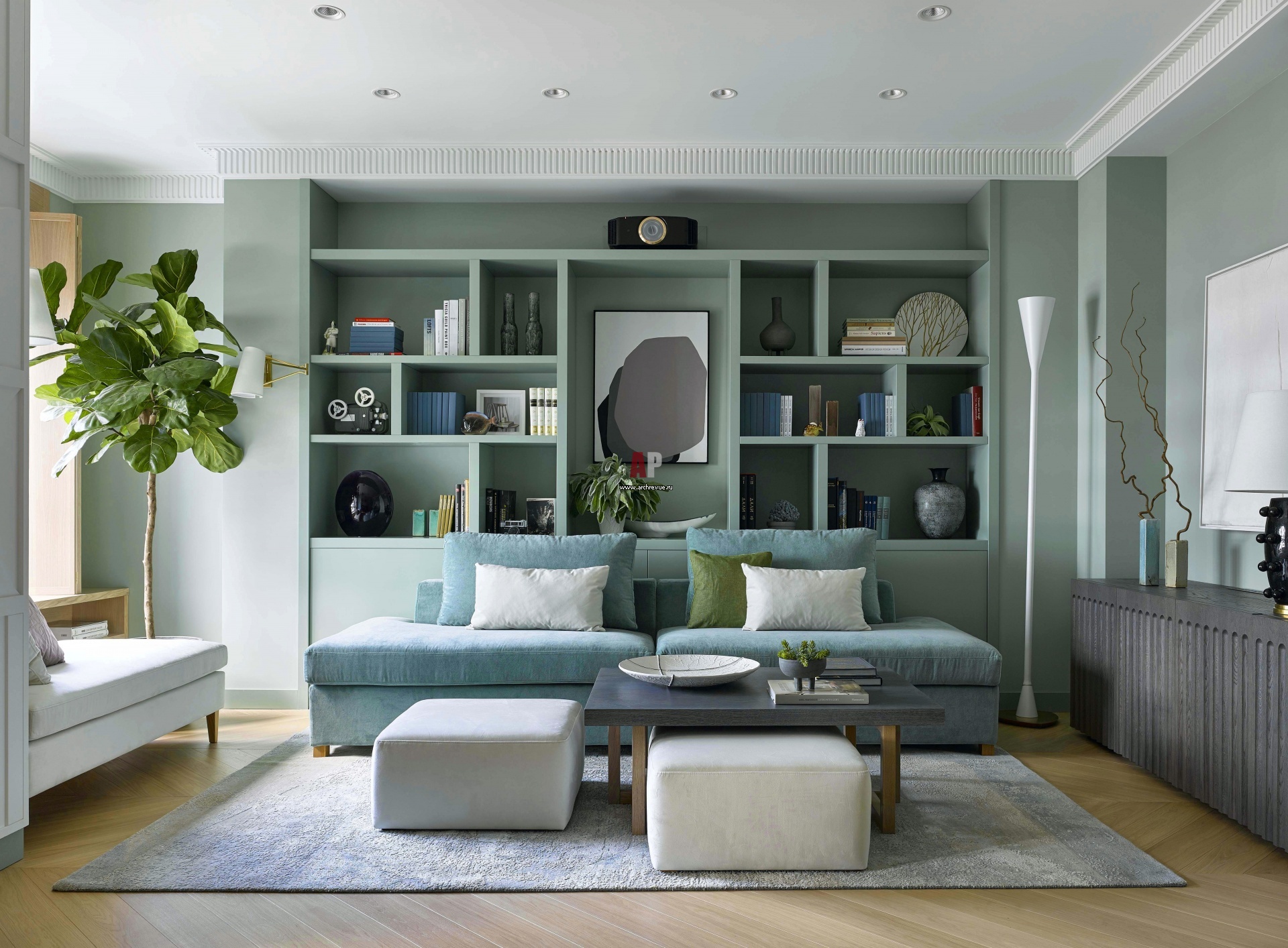 Стены и встроенная мебель в гостиной выкрашены краской мятного оттенка, Designers Guild, № 86. Стеллаж и вся мягкая мебель сделаны на заказ. Торшер, Visual Comfort & Co by Kelly Wearstler. Картина работы Екатерины Нечаевой. В общей зоне спроектирован домашний кинотеатр со встроенным в потолок выдвижным экраном и современным оборудованием.