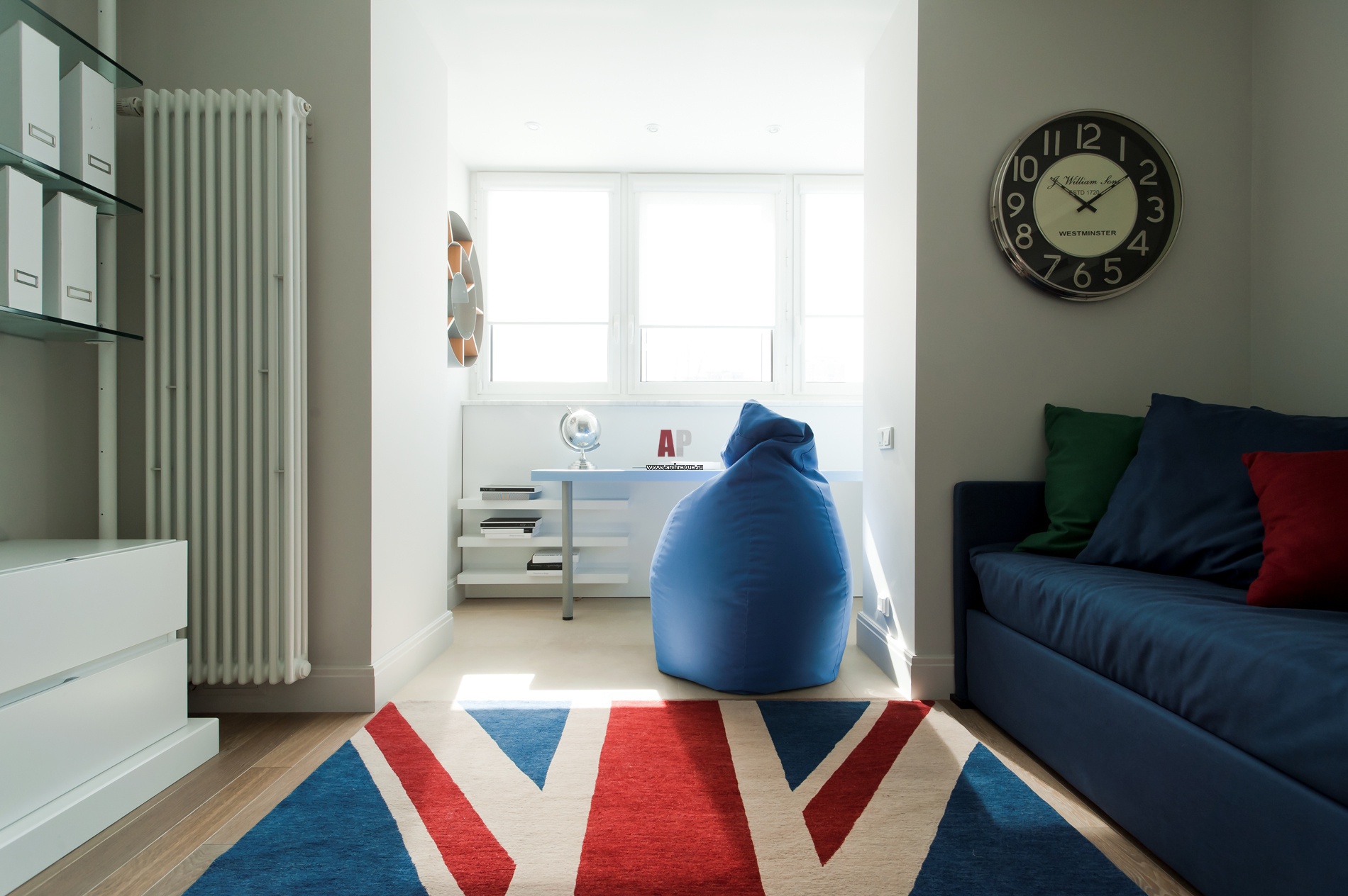 В детской мальчика архитектор присоединила балкон и на его месте организовала рабочую зону. Стол, шкафы, тумбы, по эскизам архитектора. Ковер, аксессуары, Andrew Martin. Пуф-мешок модели Mod Sacco от Zanotta.