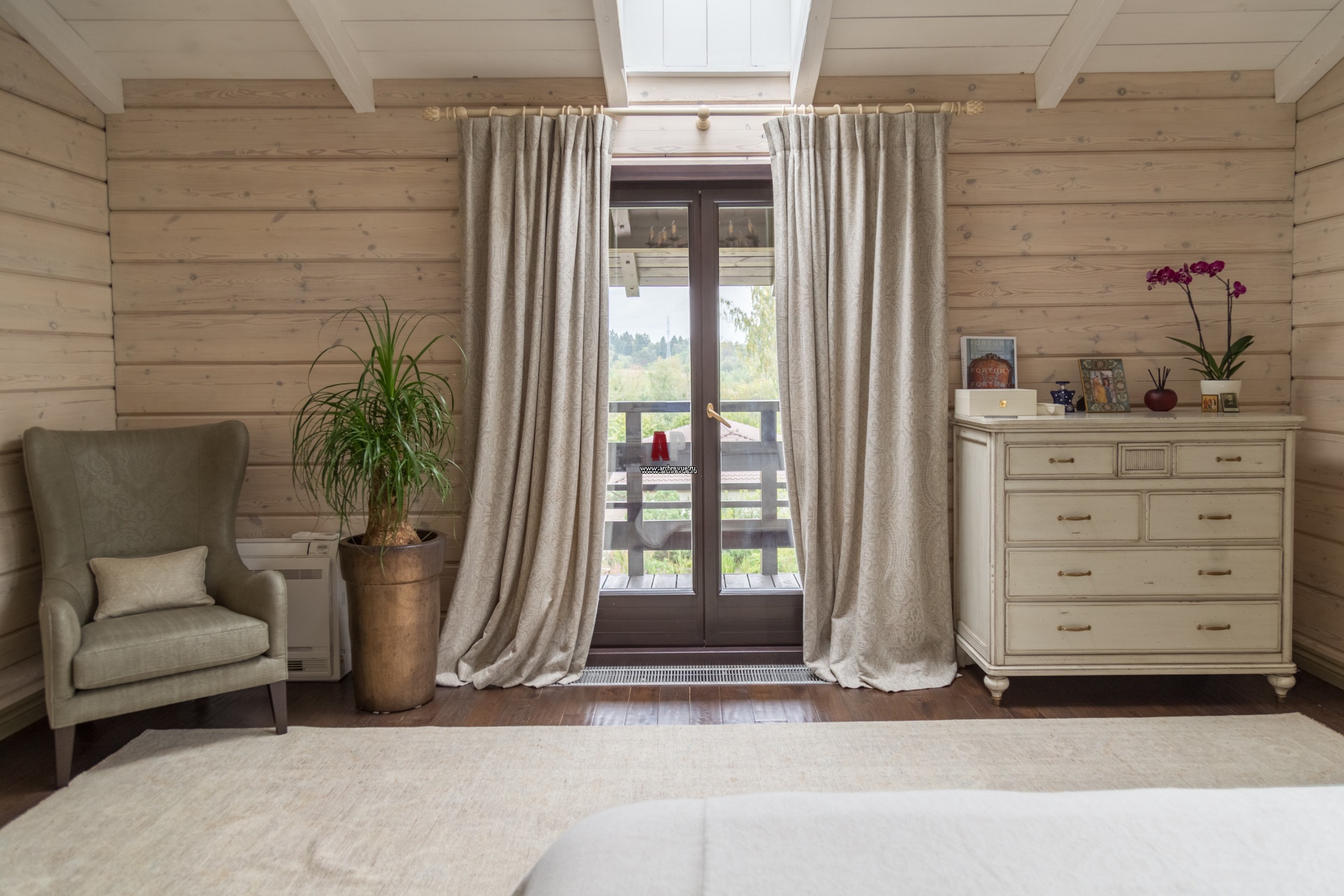 Одна из спален на втором этаже. Все помещения решены в теплой светлой колористике.