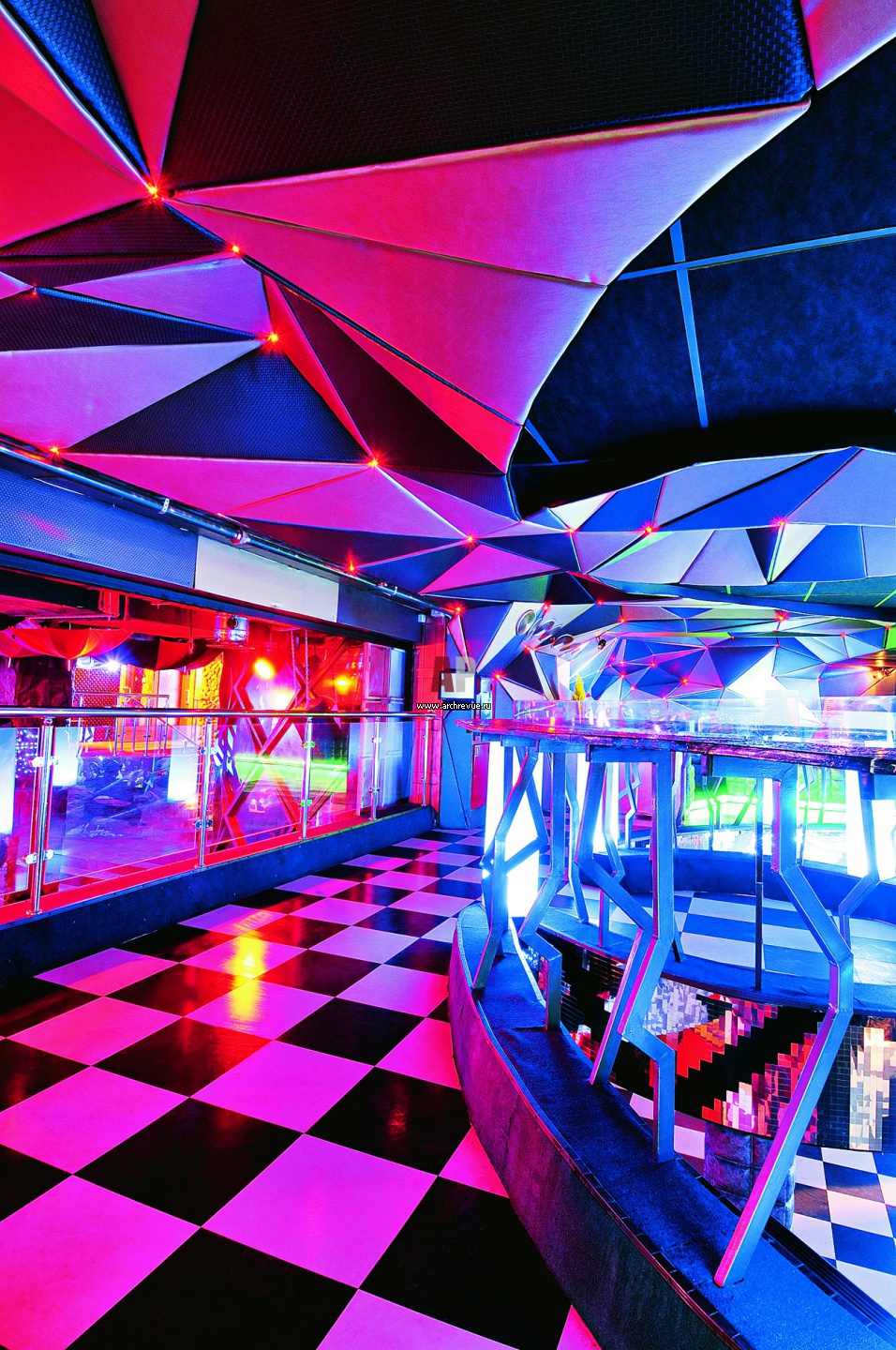 Фрагмент интерьера верхнего уровня клубной зоны в стиле китч. Важную роль в формировании облика пространства играет клубная подсветка.