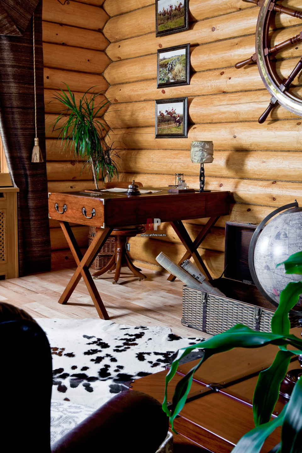 Кабинет решен в колониальном стиле и меблирован предметами фабрики Starbay. Их особенность – складные ножки, которые превращают вещи в сундуки, а также боковые ручки. Они позволяют переносить предметы с места на место.