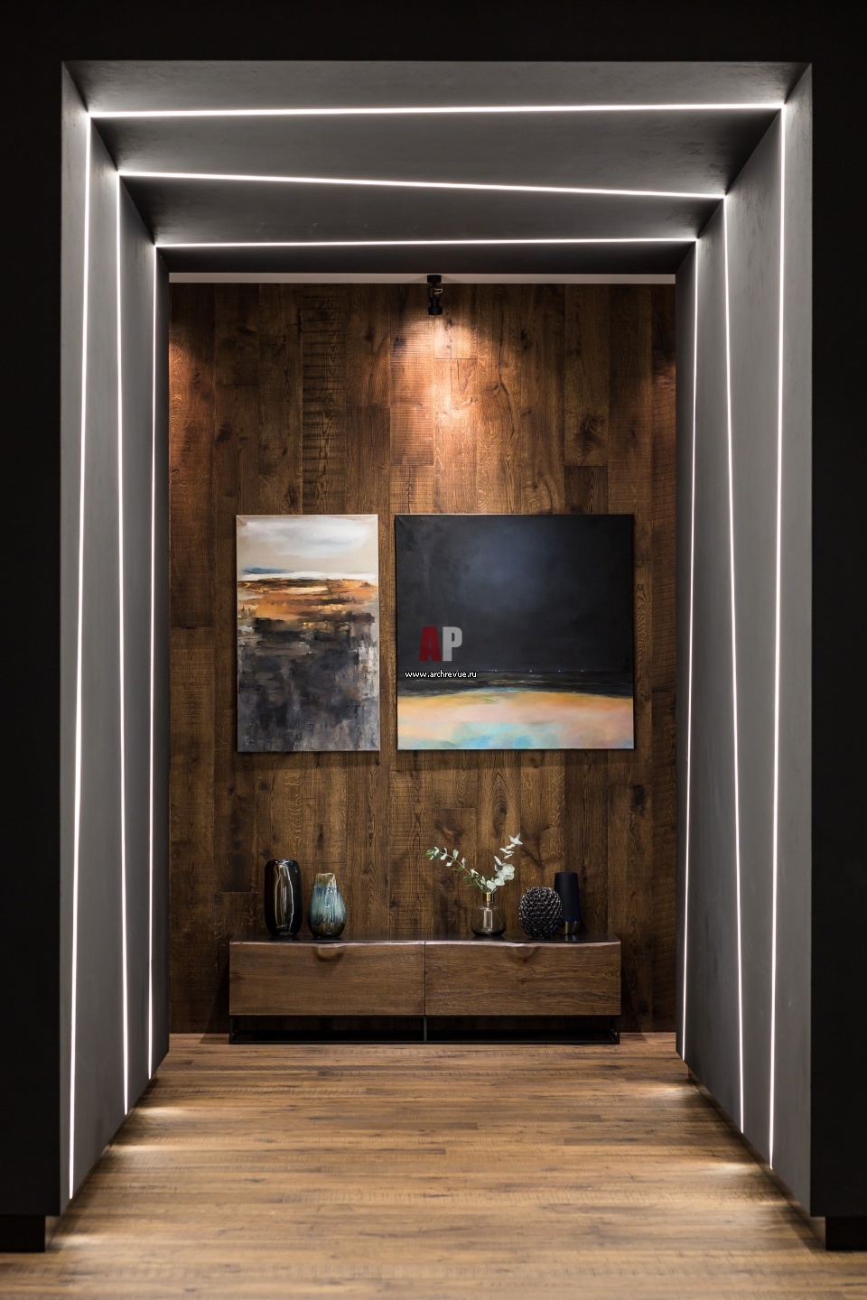 Обшитый брутальным деревом коридор с декоративным световым порталом ведет в спальню. Деревянная тумба с как бы отогнутыми фасадами изготовленная по эскизам авторов проекта.