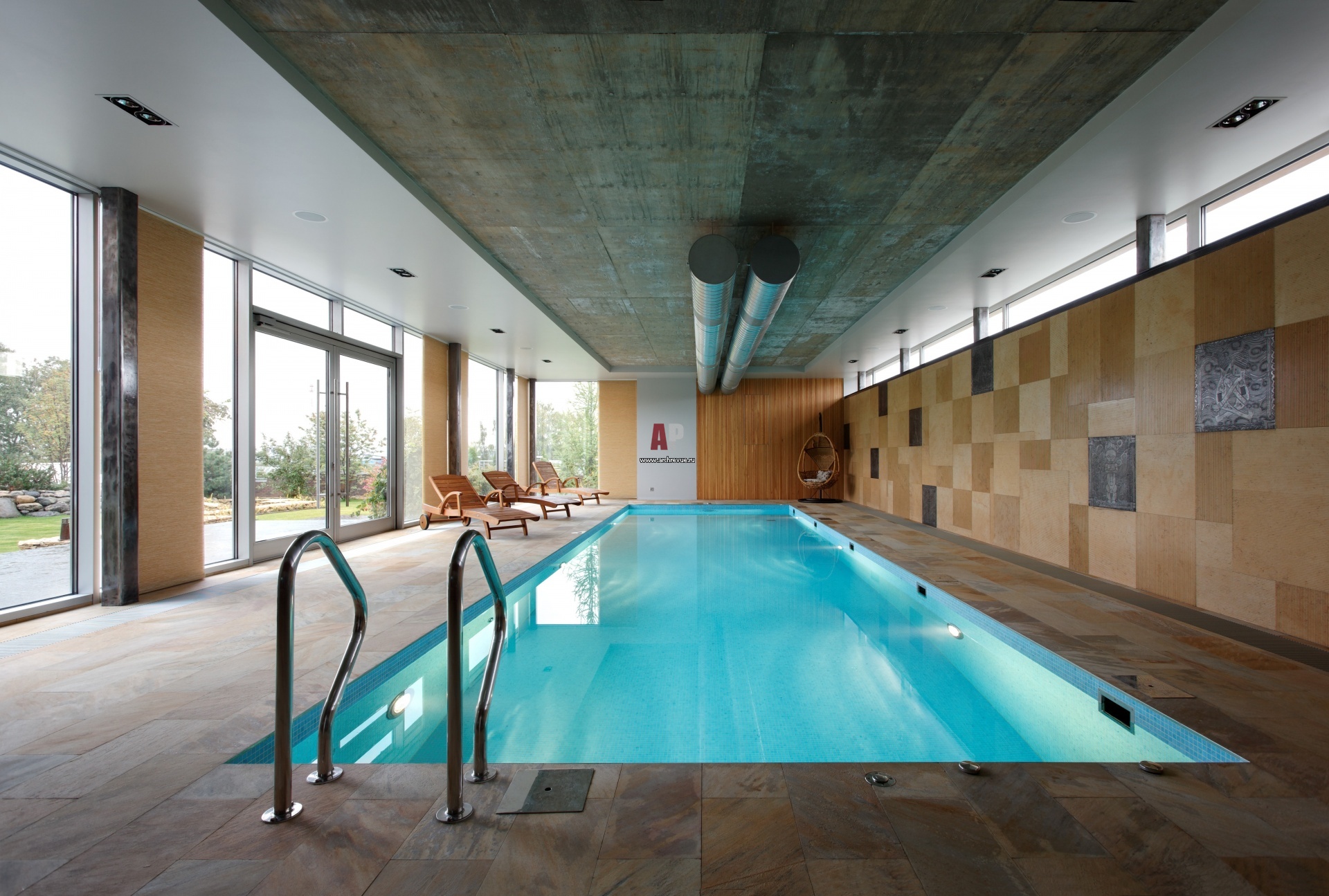Бассейн расположен в пристройке. Его пол и стены облицованы кварцитом – камнем, который имеет сложный цвет и интересный природный рисунок.
