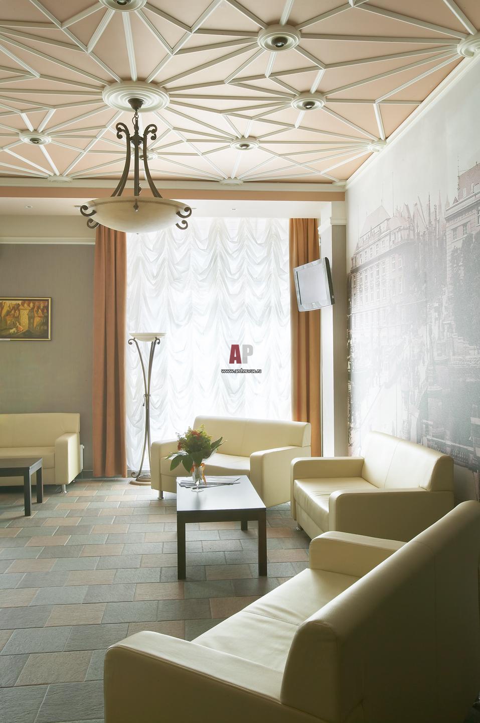 В общественных помещениях внимание привлекают фотообои с видами старого Калининграда. Они вместе с мебелью, созданной по индивидуальному проекту компанией «Нимакс», создают дополнительный уют.