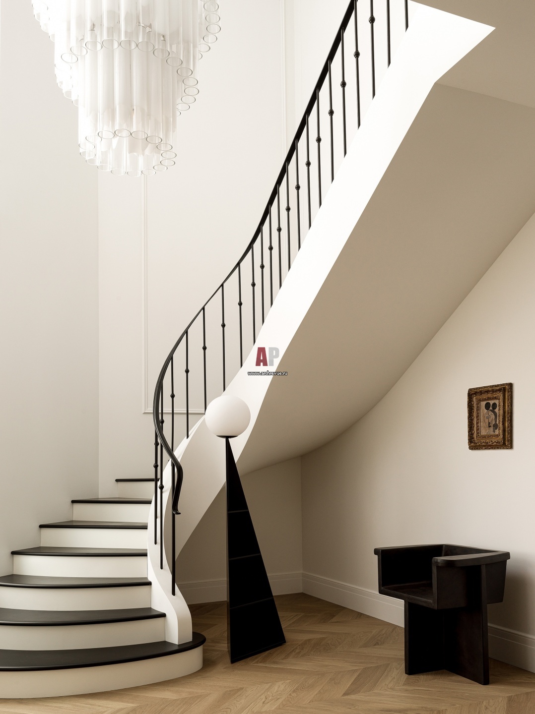 Лестница существовала ранее. Ее плавно закручивающуюся форму уравновешивает вертикальный торшер, Atelier Areti. В лаконичном монохромном пространстве он играет роль арт-объекта.