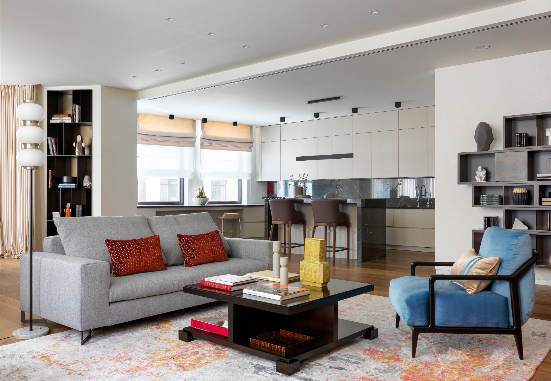 Центральное помещение в квартире – большая общая гостиная. Кресло и журнальный столик, Selva. Диван, Molteni&C. Стеллажи, Meritalia и De Castelli. Вазы, BoConcept и Attribute.