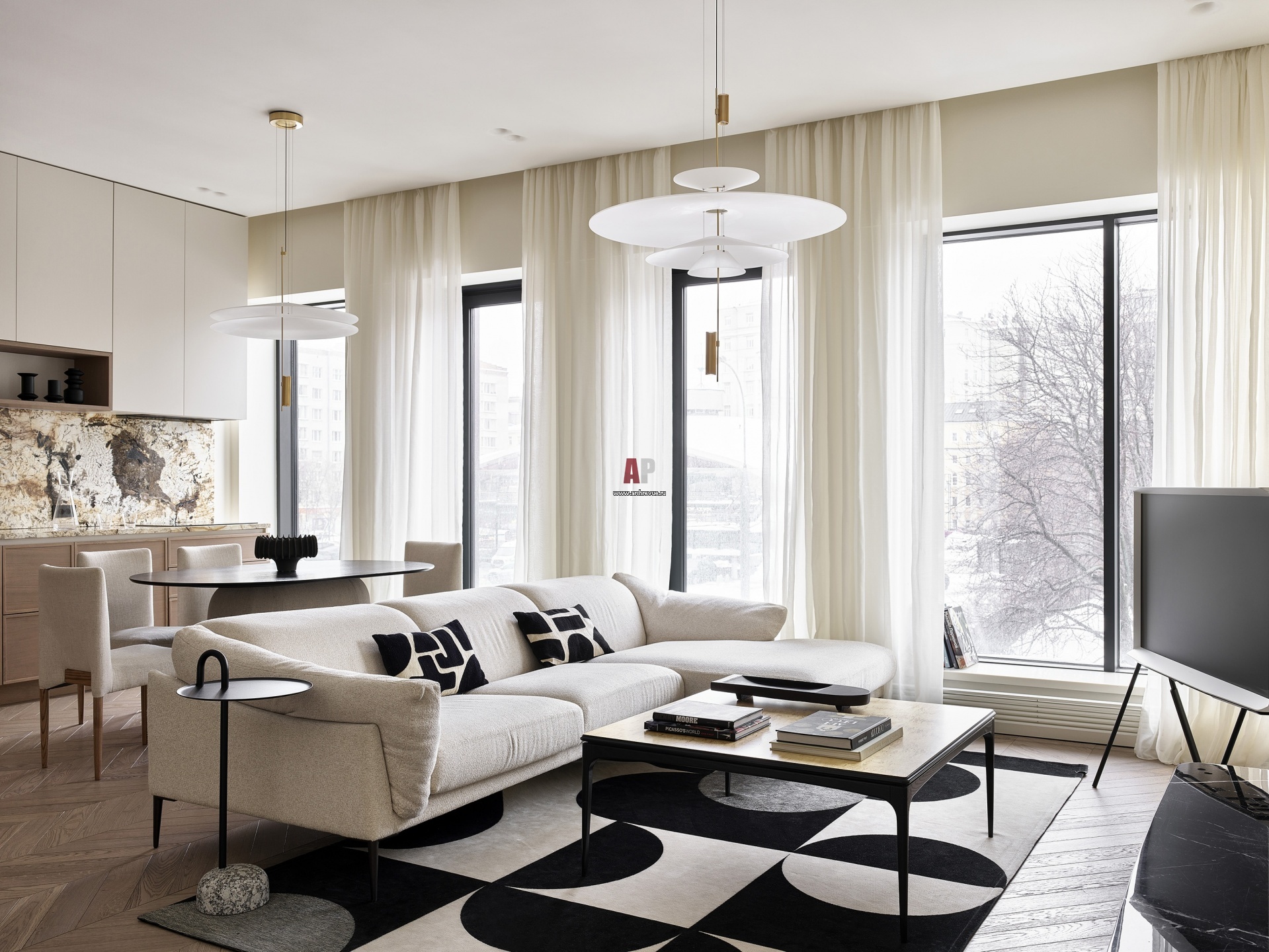 Украшение гостиной – ряд панорамных окон. Благодаря тому, что подоконники расположены на высоте 40 см от пола, их можно использовать в качестве витрин и открытых полок для хранения книг по искусству.