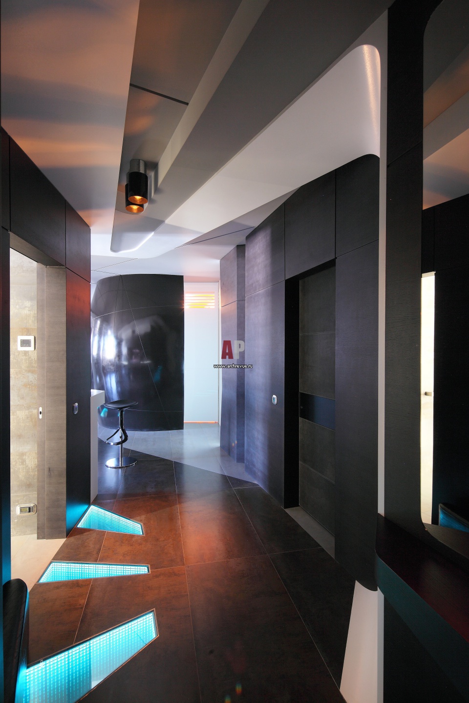 Отделка пола с оптическим эффектом глубины создана по запатентованной технологии magic mirror. Светодиодные светильники имеют многократные отражения, благодаря двум вмонтированным зеркалам общей толщиной 40 мм.