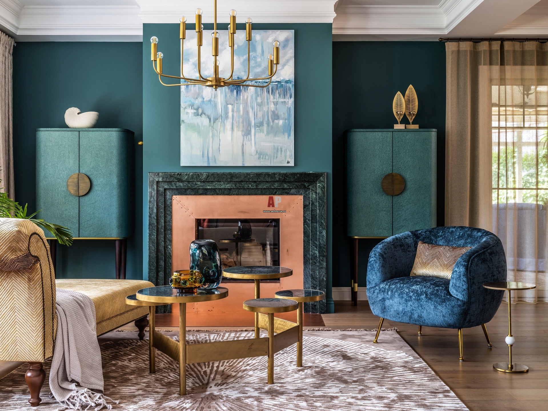Портал камина изготовлен из мрамора и листовой меди и отсылает к эстетике ар-деко. Парные комоды-бары на высоких ножках сделаны на заказ по чертежам дизайнера из шпона «птичий глаз», затонированного в сине-бирюзовый цвет/