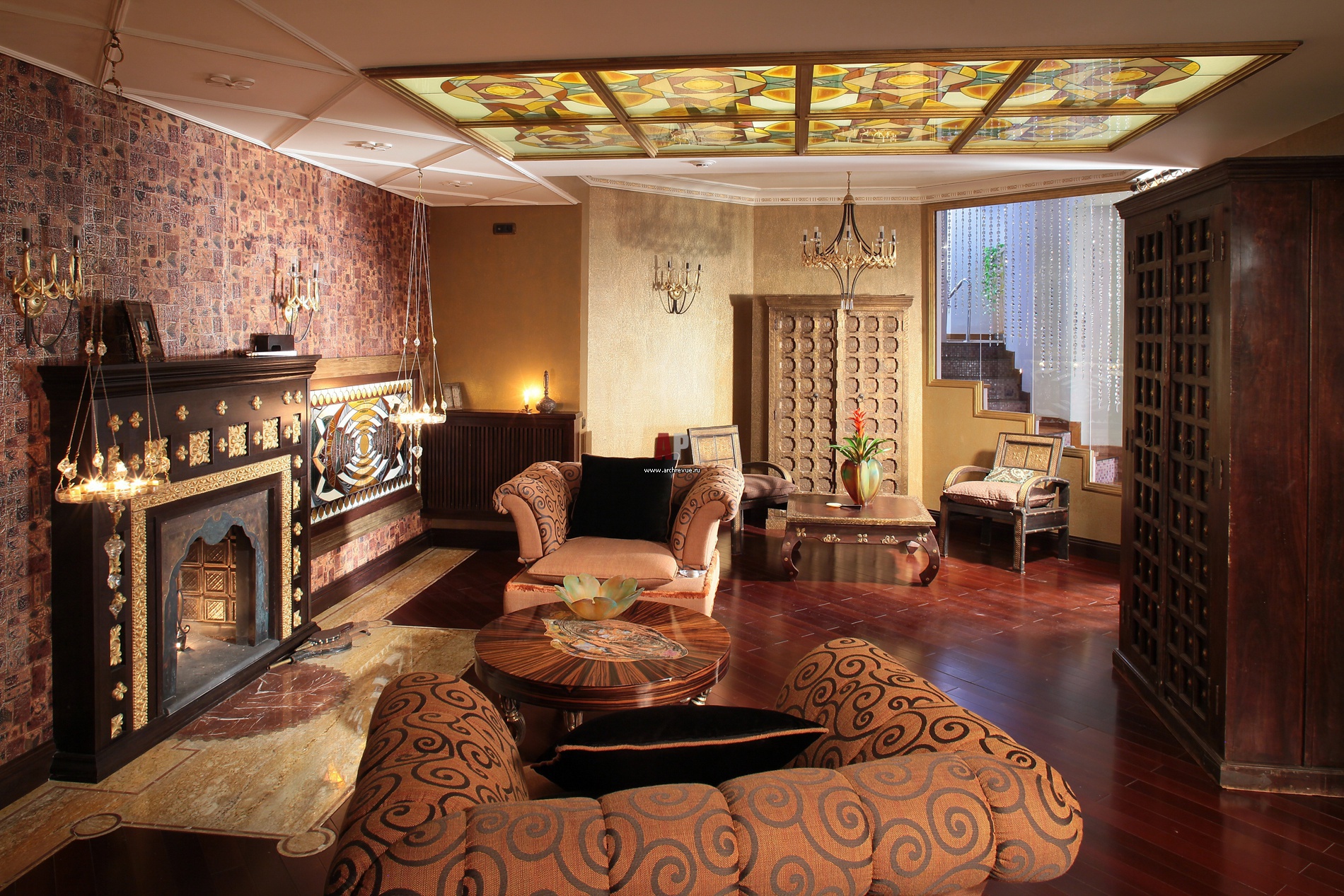 Каминная в цокольном этаже. Стиль этого помещения определила мебель, привезённая из Занзибара, поэтому в его дизайне видны восточные мотивы. Потолочный витраж сделан художниками из Санкт-Петербурга. Мягкая мебель, Elledue. Светильники, MMLampadari.