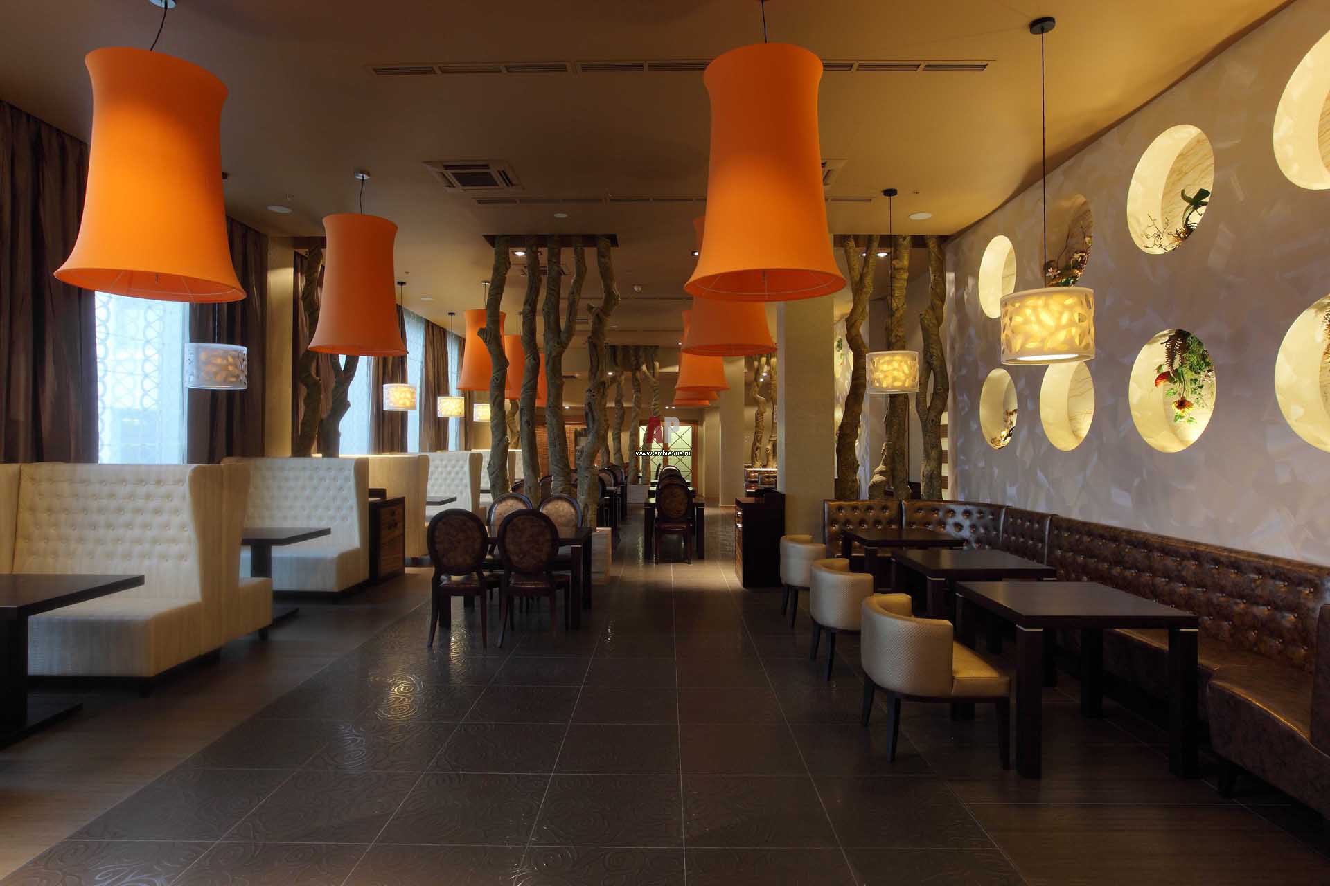 На полу основного зала панно из керамической плитки шоколадного цвета с рельефным орнаментом. Плитка Petracer’s, поставщик RIM.ru.