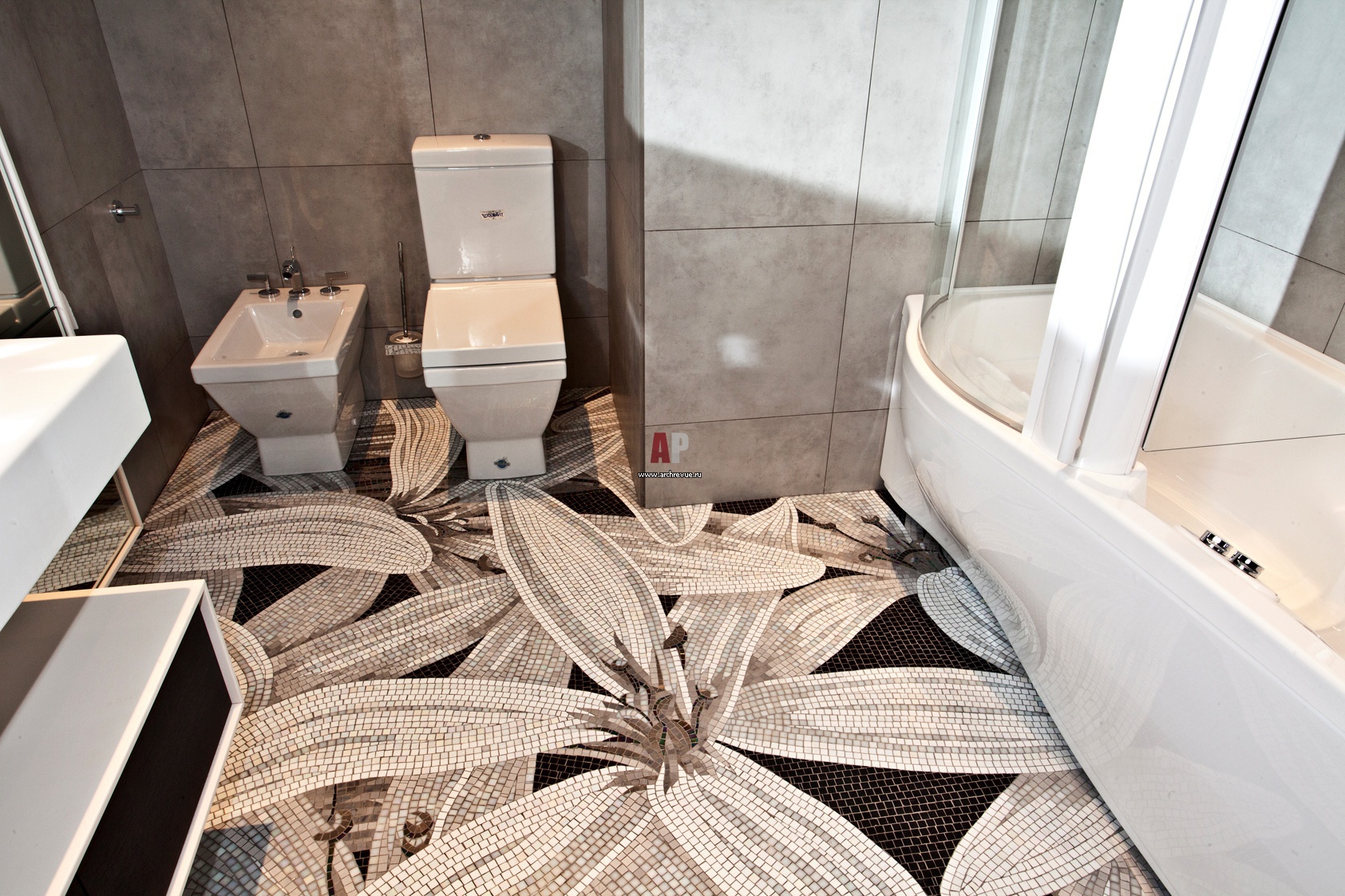 Гостевой туалет в современном стиле. Интерьер строится на контрасте плитки под бетон и черно-белой мозаики. Мозаичным панно с цветами украшен пол.