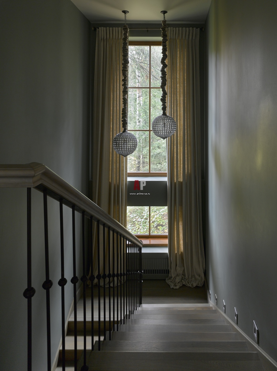 Лестница на второй этаж. Высокие окна обрамлены пятиметровыми в длину шторами. Люстры, Fancy Home Collection.
