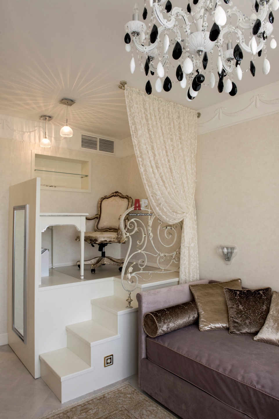 Интерьер детской. На ступенчатом подиуме – рабочая зона. Ограждение лестницы, ковка, золочение.