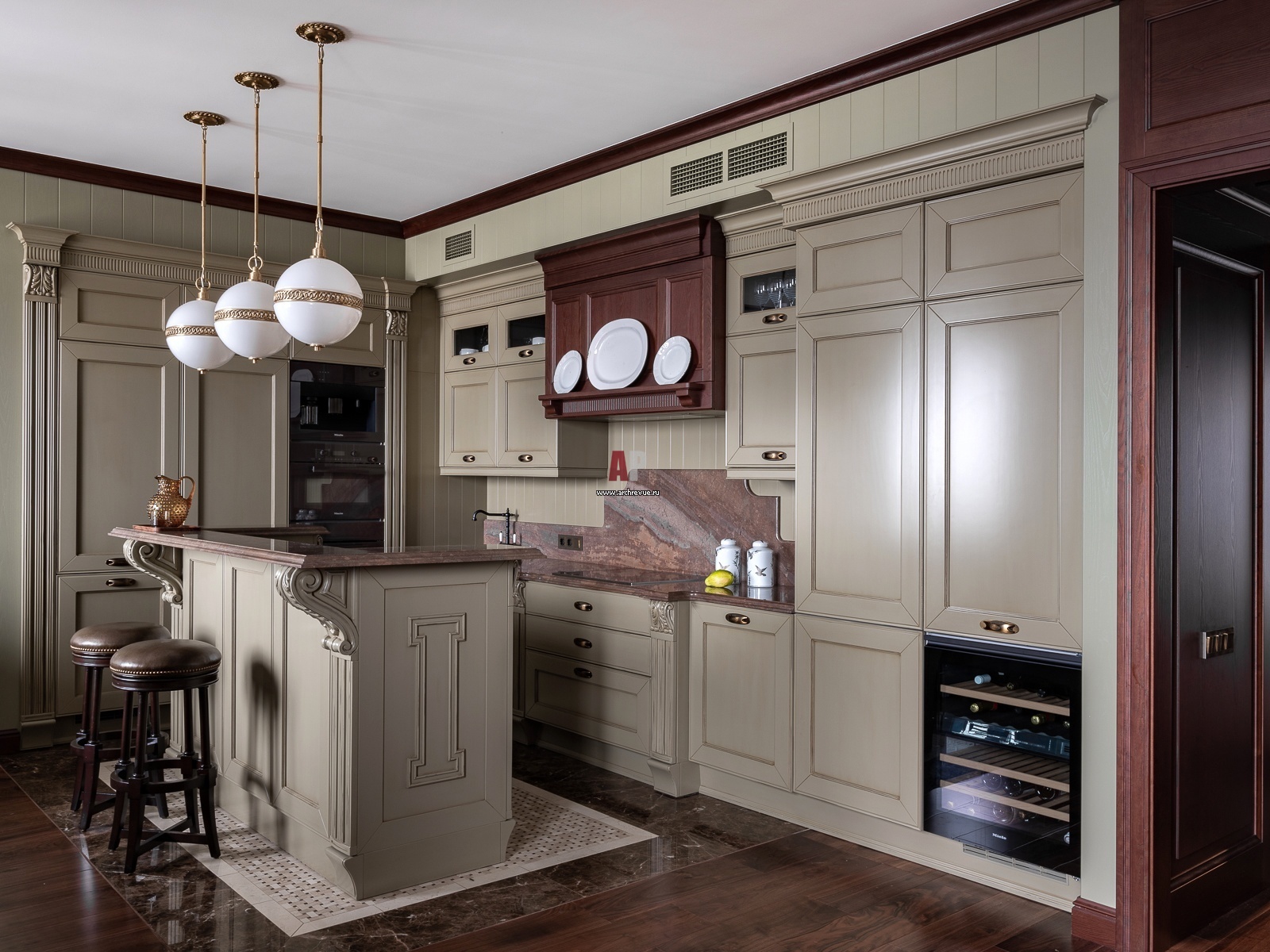 Кухня в классическом стиле с островом, Aster Cucine. Столешница из кварцита Nougat. Барные стулья, Hancock&Moore. Светильники над островом, Visual Comfort & Co.