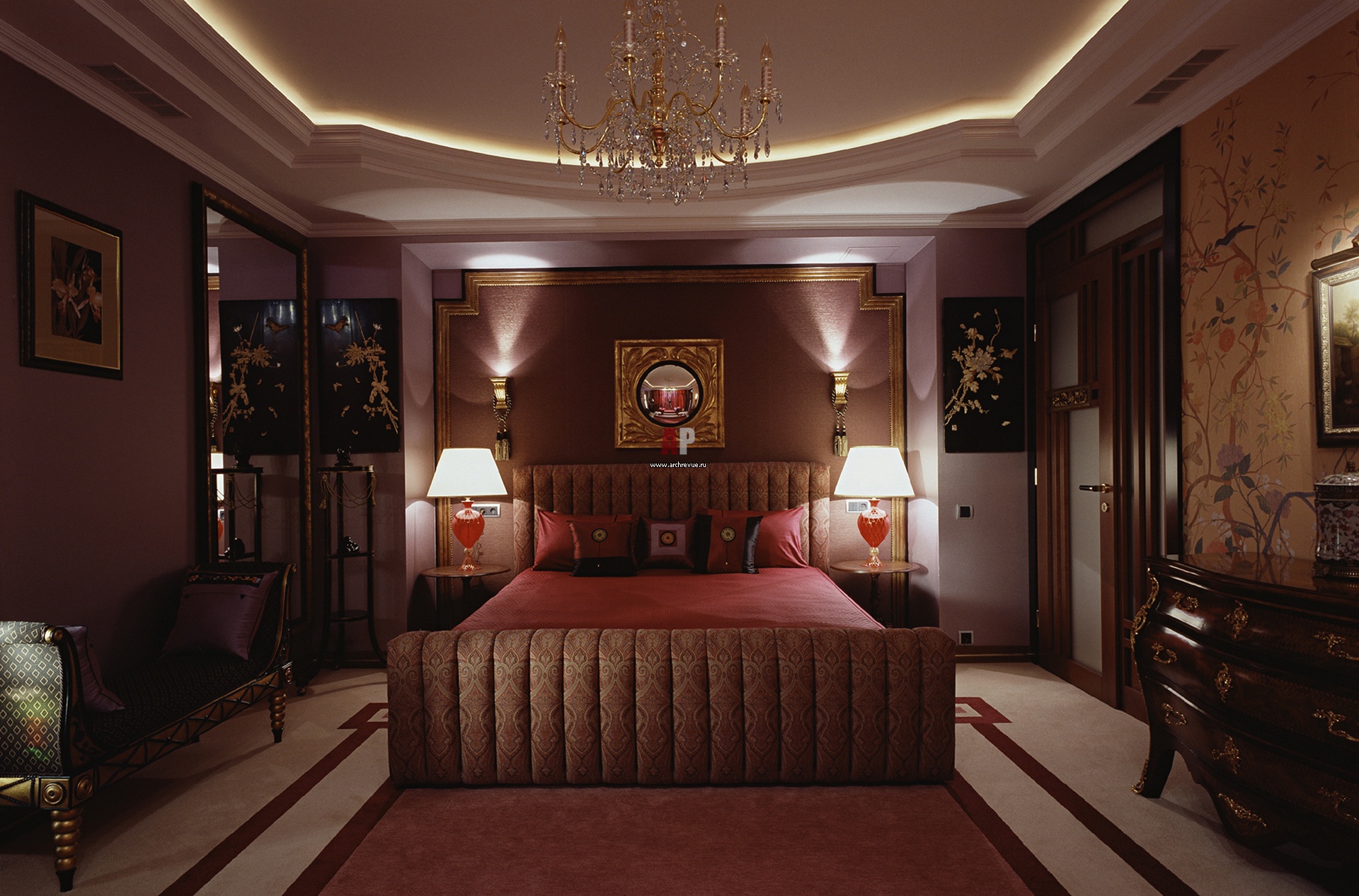 Оформление интерьера спальни подсказали лаковые китайские панели. Восточная стилистика, шелка, лаковые поверхности мебели и крупные узоры древовидных пионов на стенах, создали атмосферу экзотики и роскоши.
