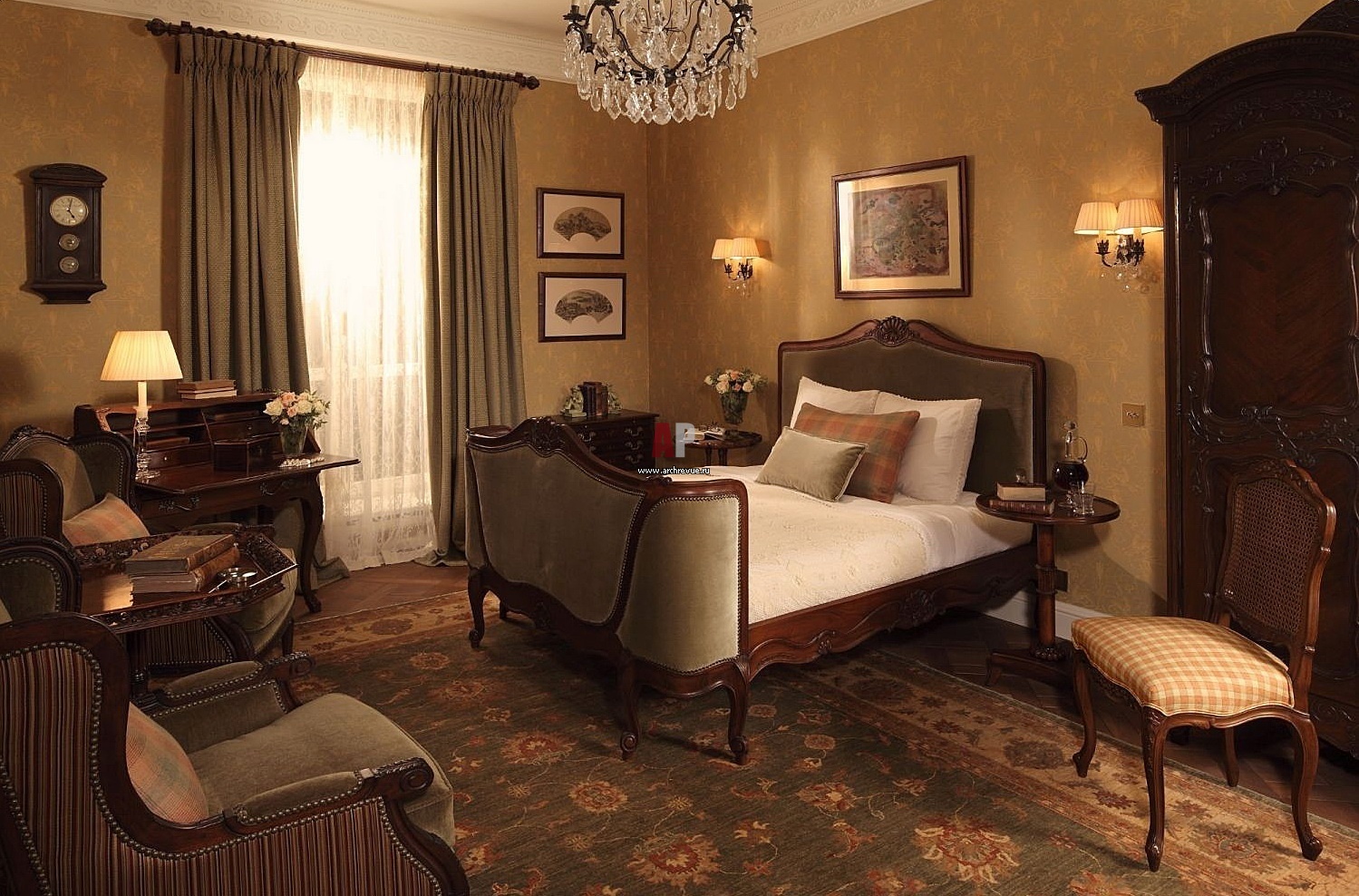 Хозяйская спальня выдержана в темных, плотных тонах с темным деревом и оливково-золотистым текстилем. Вся мебель изготовлена во Франции по старинным технологиям и представляет собой исторические реплики. Кресла, Beaumont & Fletcher. Шкаф и кровать, Ovation.