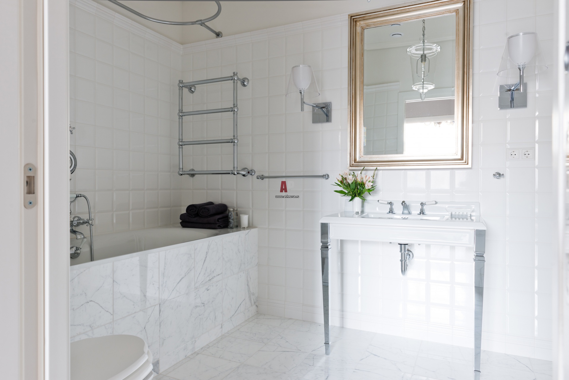 Белая ванная комната. Сантехника, смесители, Devon & Devon. Настенные светильники, Flos. Подвесной светильник, De Majo Illuminazione.