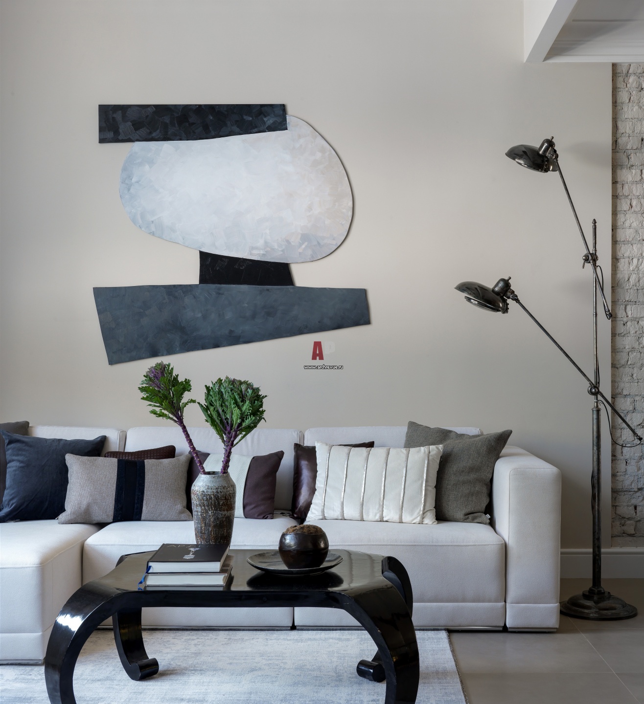 Гостиная получилась эклектичной. На фоне нейтральных оттенков стен и текстиля доминируют мебель и современное искусство. Над диваном – композиция Натальи Наумовой «Несбыточное равновесие».