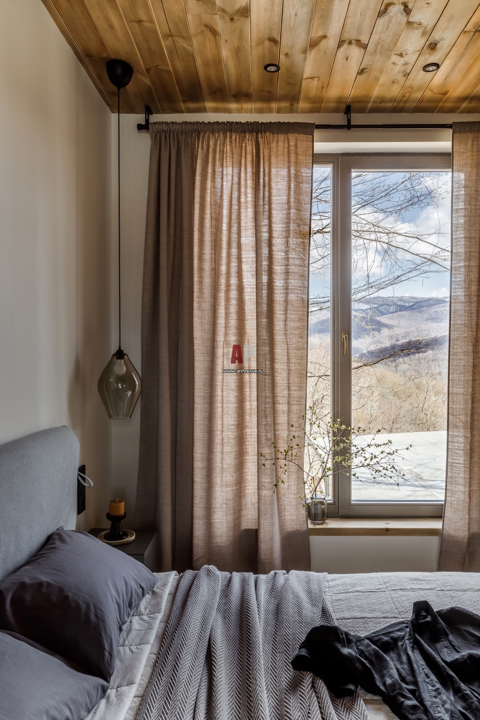 Пол и потолок пальни зашиты тонированной деревянной доской, благодаря такой отделке помещение выглядит более камерным и уютным.