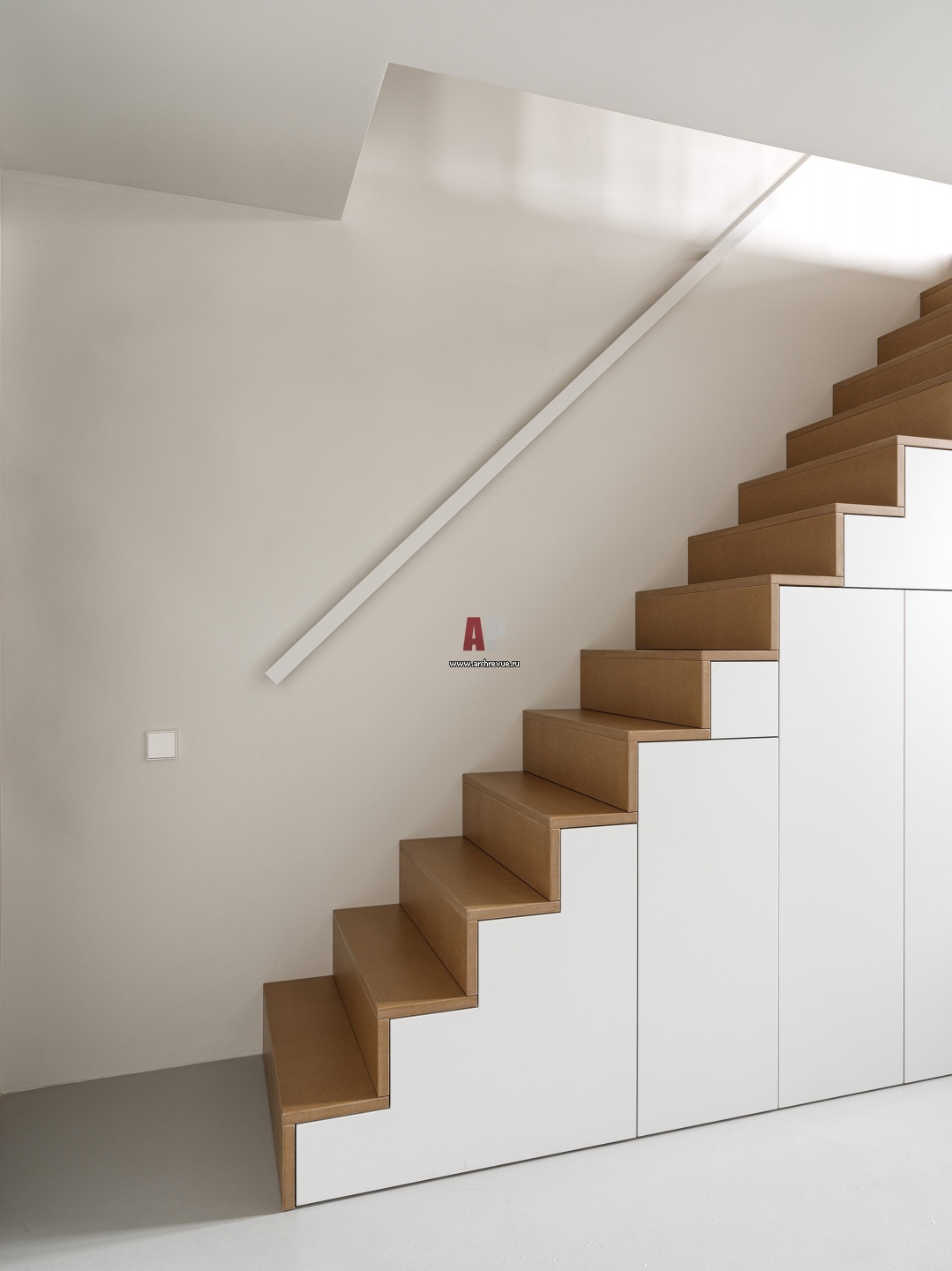 Лестница со встроенной системой хранения изготовлена на заказ. Она ведет в спортивную зону на втором ярусе.