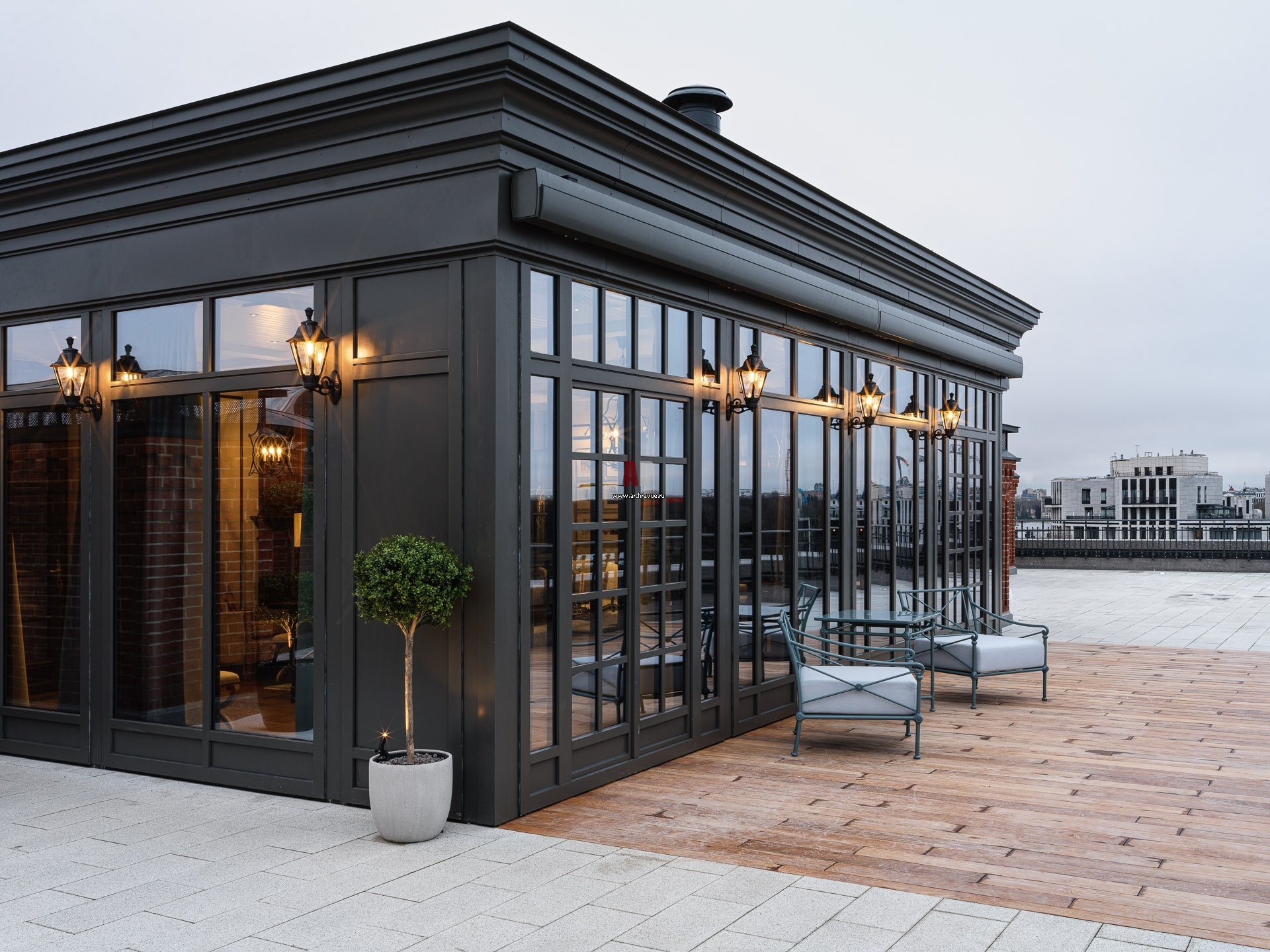 На эксплуатируемой кровле были возведены два теплых всесезонных павильона для досуга большой семьи. Темные профили террасы создают графичный каркас, а панорамное остекление стирает границу между интерьером и городским пейзажем.