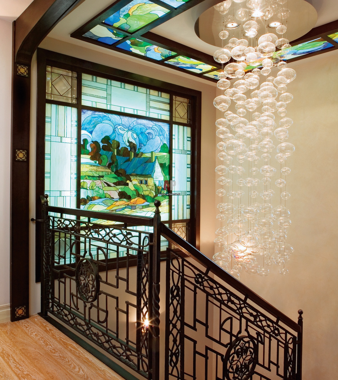 Богато декорированный лестничный марш «собирает» крупный нейтральный по стилистике светильник с ниспадающими шарами.