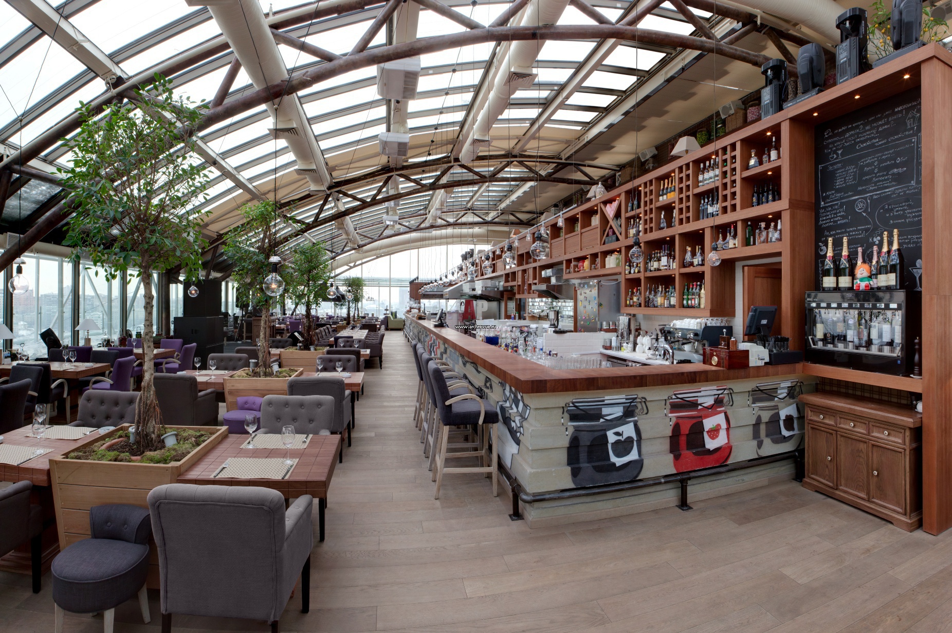 Световой купол декорирован шторами с электроприводом, текстильный дизайн «Акид проект ». Шторы-плиссе открываются секциями с пульта управления. Барная стойка длиной 22 метра оформлена декоративной штукатуркой под бетон, изготовитель «Италдекор», и авторской росписью.