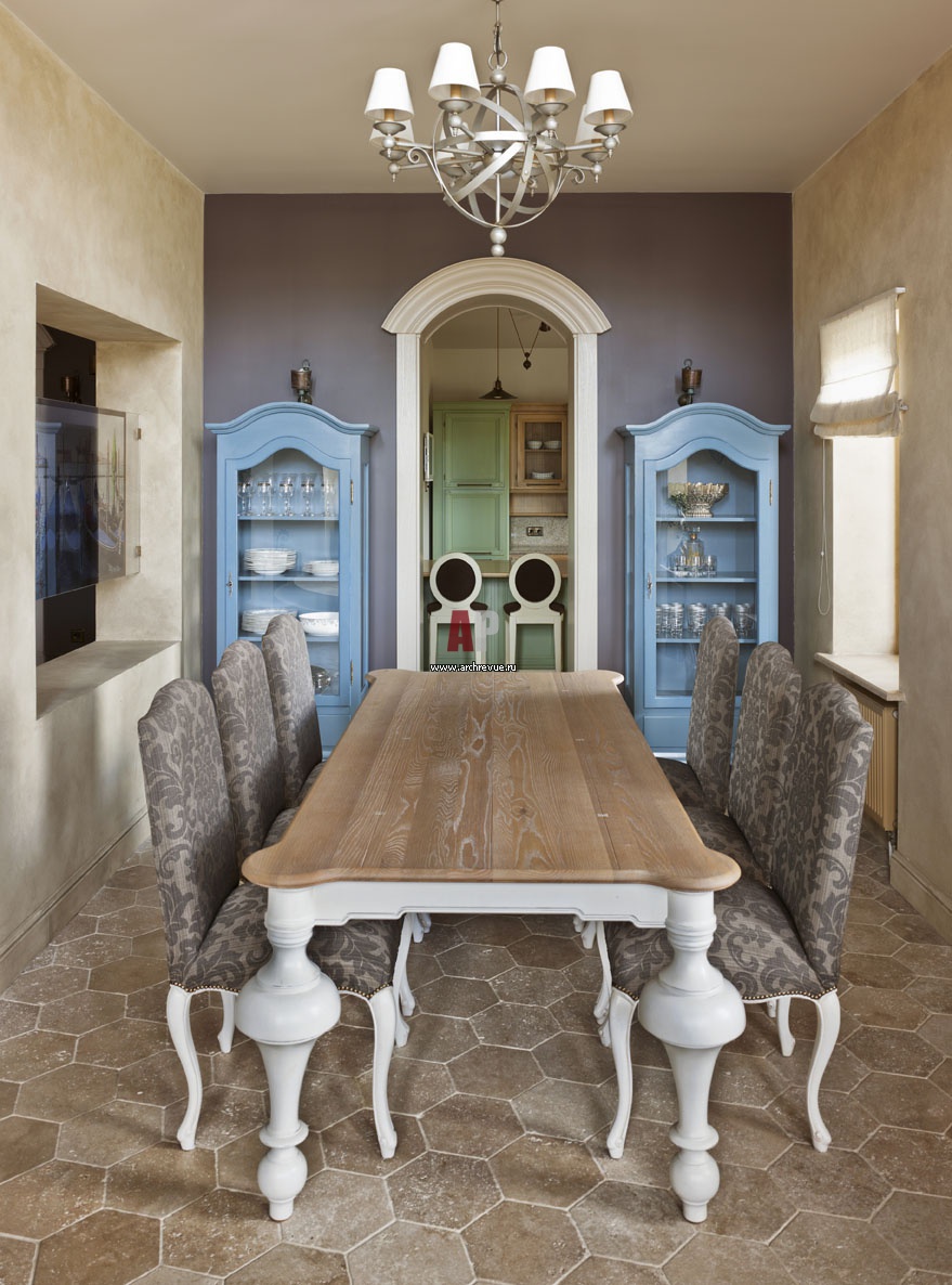 Фото интерьера столовой группы с парадным обеденным столом. Стол Dialma Brown. Витрины нежно-голубого цвета, Tonin Casa.
