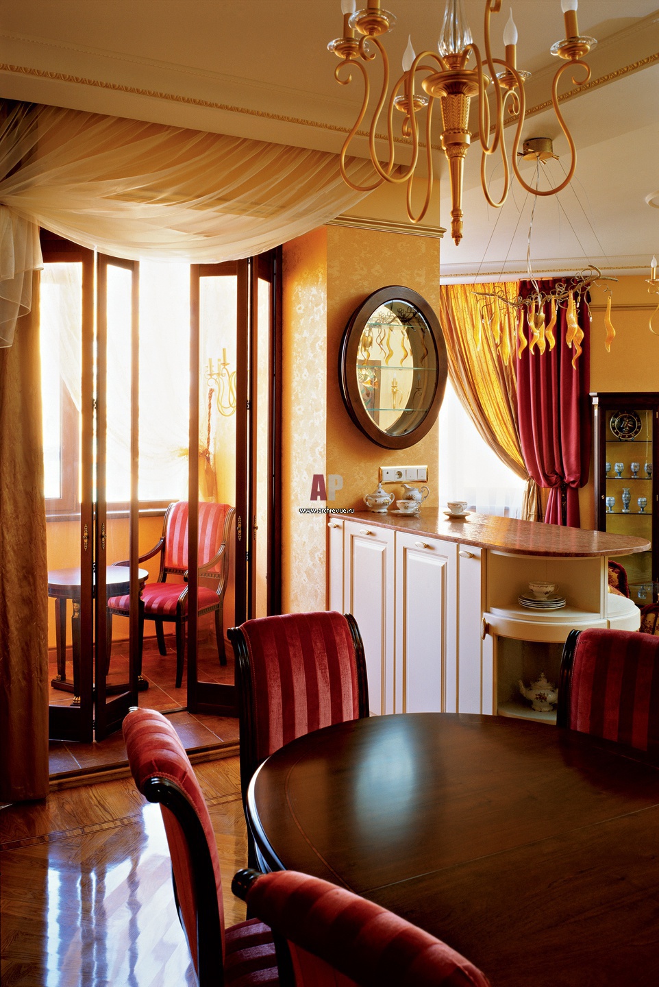 Кухня является продолжением гостиной. Небольшой балкон утеплен и превращен в уютную беседку, где так приятно пить по утрам горячий кофе. Перегородка-гармошка, выполнена мастерами «Астек Стиль».