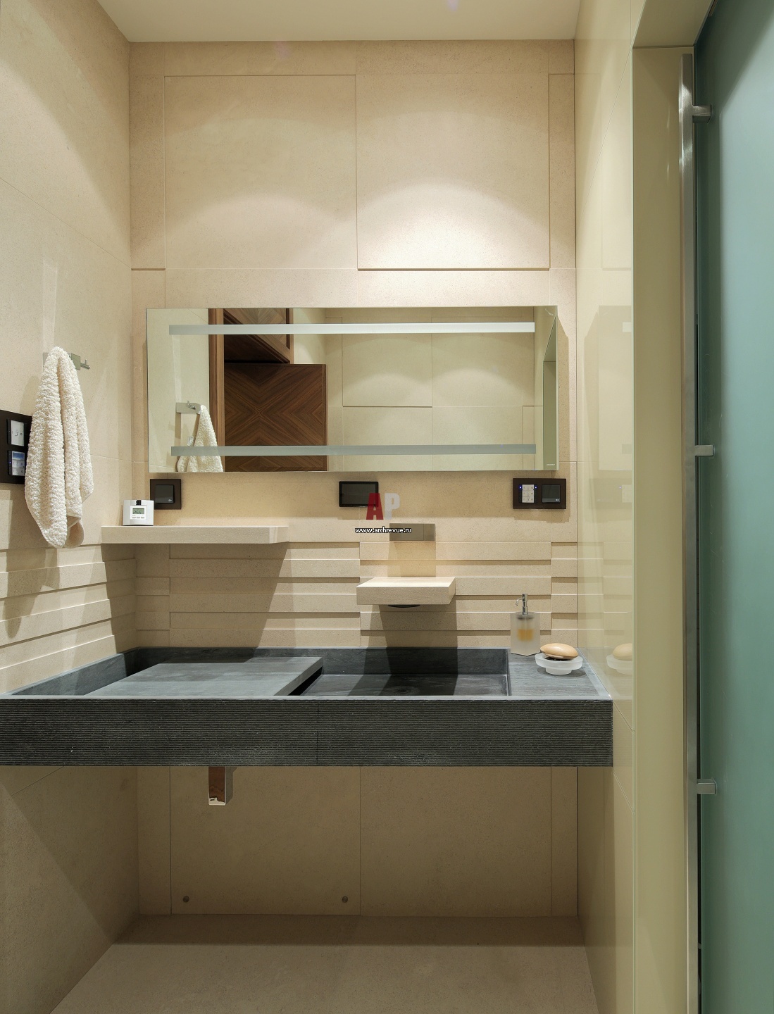 Пол и стены в гостевом санузле отделаны нешлифованной мраморной плиткой разной толщины. Раковина, полочка и накладка на смеситель выполнены из мрамора. Сантехника и зеркало, Antonio Lupi.