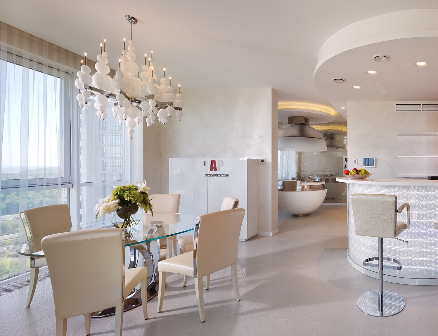 Интерьер зоны столовой возле панорамного окна. Белоснежный интерьер меблирован овальным стеклянным столом, стульями из кожи цвета слоновой кости с латунными вставками и комодом с белыми глянцевыми дверцами. Авангардный светильник набран из белых шариков.