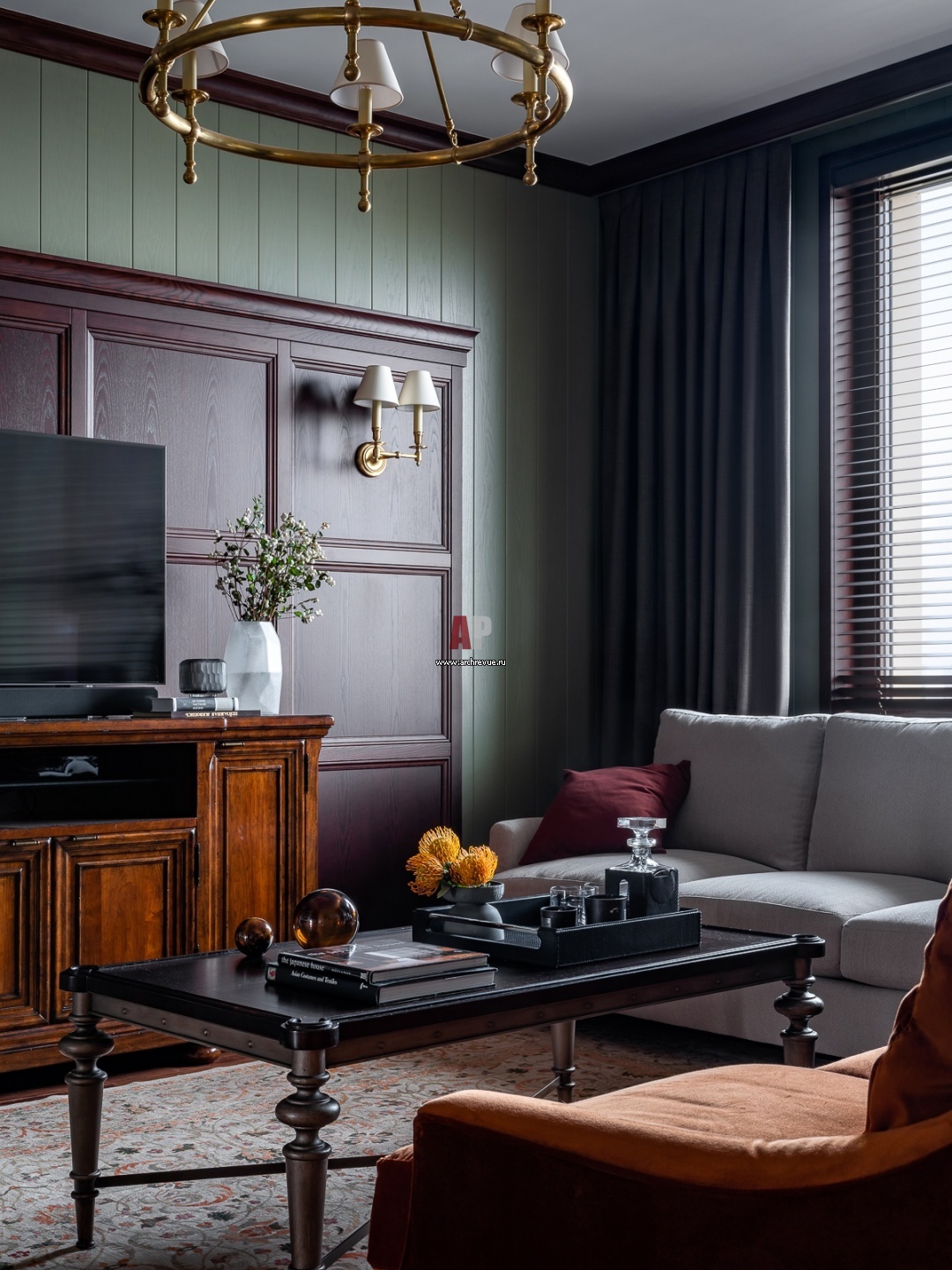 Гостиная зашита панелями двух видов: из темного шпона дерева и с тонировкой в оливковый цвет. На полу – массивная доска, американский орех.