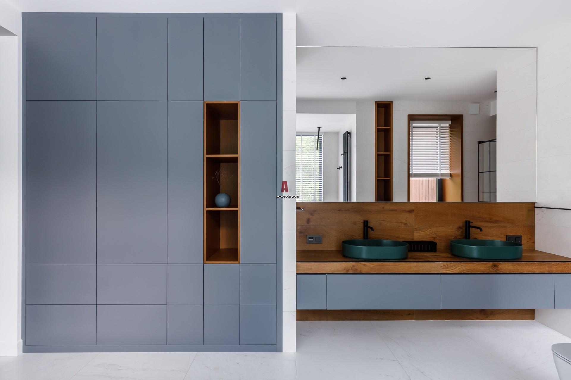 Хозяйская ванная комната. Раковины из цветной керамики, Ceramica Cielo. Смесители, Noken. Слева – большой встроенный шкаф с системой открывания полок пуш-ап.